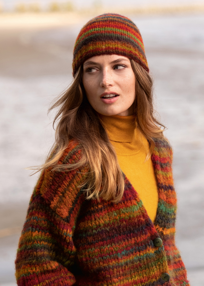 Lana Grossa Twin 25 g (37% (baby) alpacka, 37% ren ny ull (merino), 26% polyamid, löplängd 200 m/25 g) 25 g röd/grön/brun/violett (färg 102); strumpstickor nr. 3,5.