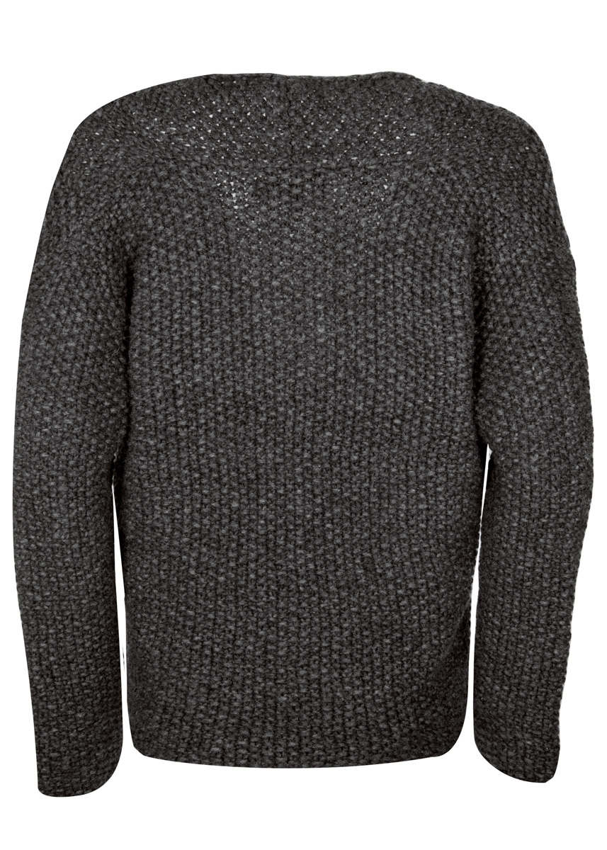 Lana Grossa-kvalitet „Lala Berlin Lovely Cotton” (75 % ren ny ull (merino superfine), 25 % bomull, löplängd = ca. 90 m/50 g): ca. 500 (550 – 600) g anthrasitt (färg 8); stickor nr. 7 och 8; 2 hornknappar 4-hål från Union Knopf, Art. 36428, ø 25 mm, färg 80 svart.