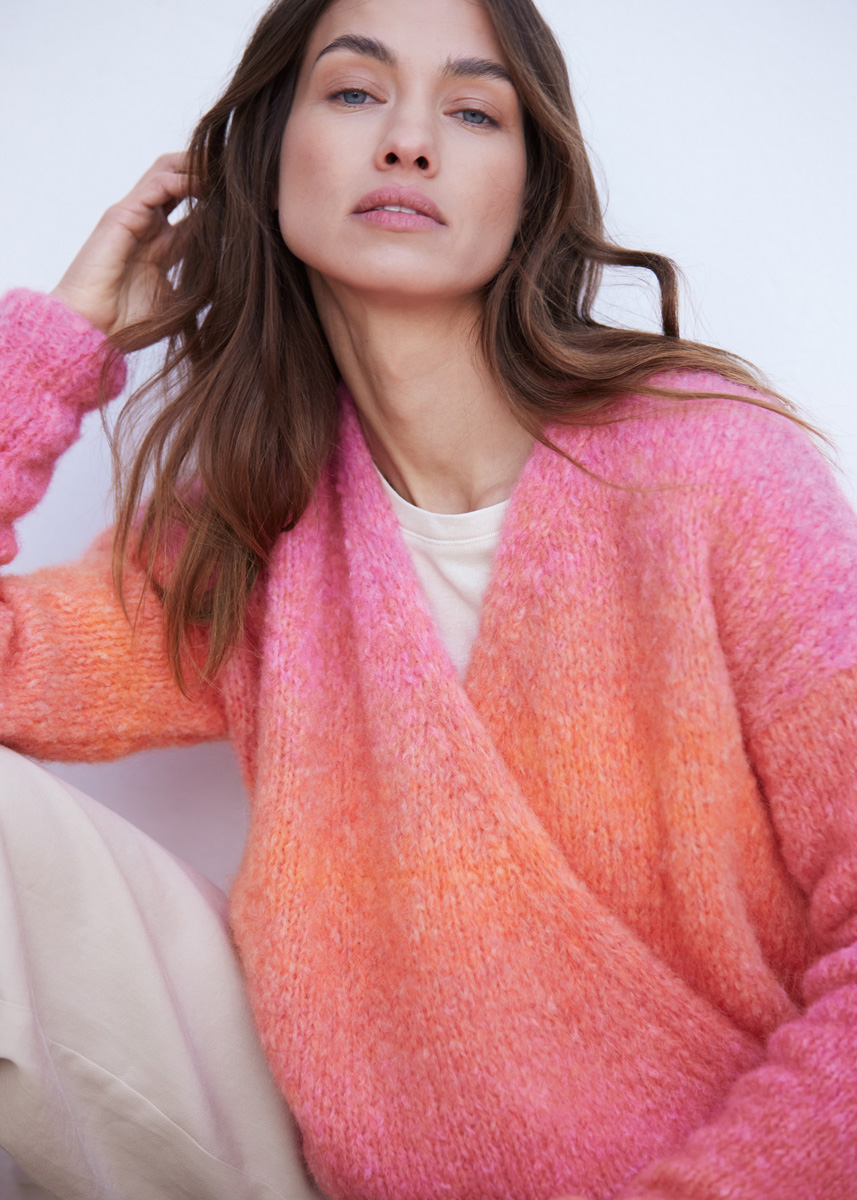 Garn: Avio fra Lana Grossa (63 % (fin) alpakka, 37 % polyamid, LL = ca. 150 m/50 g): ca. 250 (300 - 300 - 350) g bringebær/ aprikos (frg nr. 12) Pinner: Nr. 5 og 5,5 og strømpep nr. 5 Tilbehør: 1 trykknapp, ca. 2 cm i diam