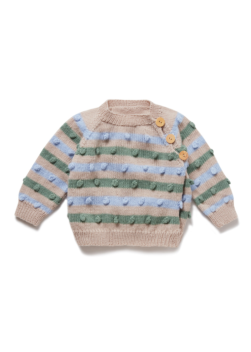 Lana Grossa-kvalitet ”Cool Wool Baby” (100 % ren ny uld, løbelængde = ca. 220 m / 50 gr.): 100(100-100- 150) gr beige (fv 212) og 50 gr resedagrøn (fv 297) og lyseblå (fv 208), rundpinde nr. 2½ og 3, hæklenål nr. 3, 3 knapper 18 mm Ø.