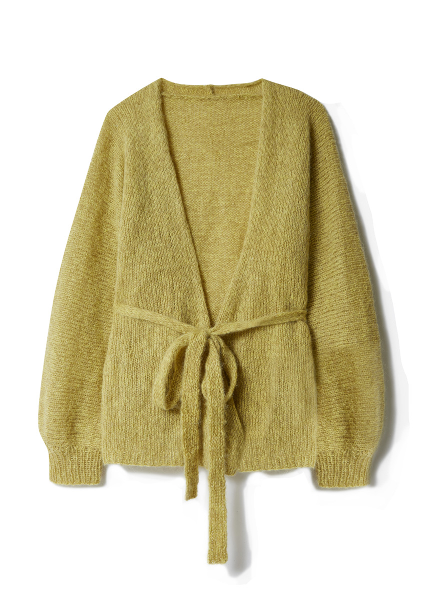 Lana Grossa „Setasuri“ (69% alpacka (Suri), 31% silke, löplängd 212 m/25 g), 125 (150 – 175) g ljusgul (färg 39) och 125 (150 – 175) g ljusoliv (färg 40); stickor nr. 4,5 och 5, 1 rundsticka nr. 5, 100 cm lång, 1 virknål nr. 3,5. OBS: Modellen stickas med dubbla trådar, 1 tråd ljusgul och 1 tråd ljusoliv!