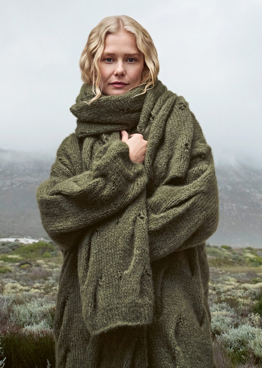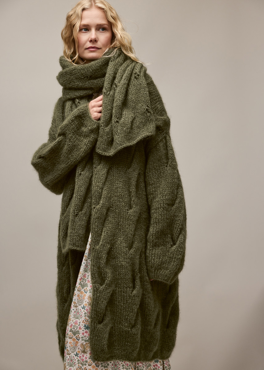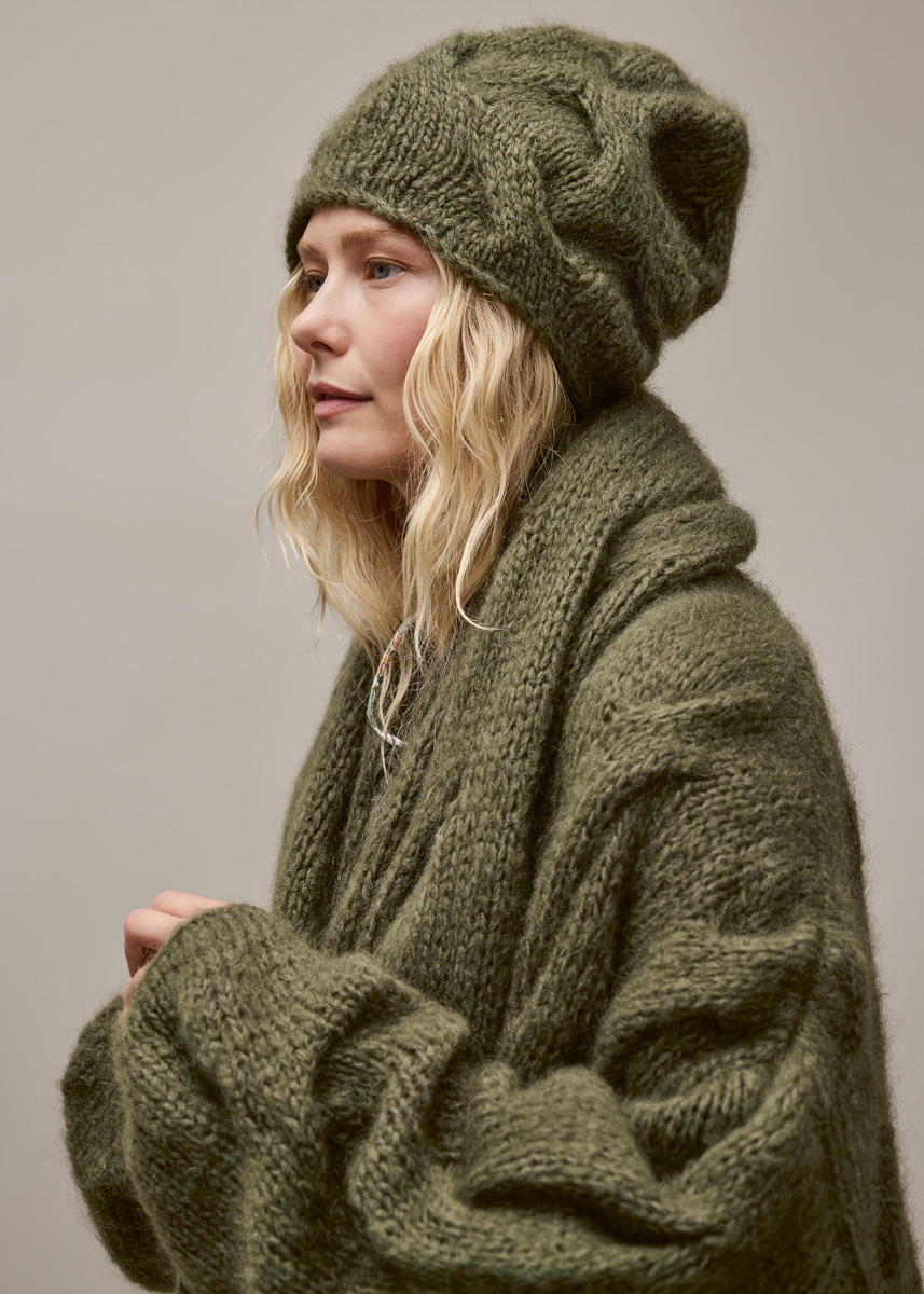 Garn: Lana Grossa Mohair di Gio (55 % mohair (superkid), 45 % ren ny ull (merino superfine), LL = 85 m/50 g): 850 (900 / 950 / 1050) g bregnegrønn (frg 14). Pinner: Rundpinne 6 og 7 mm, 80–100 cm lang, rundpinne 6 mm, 40 cm lang (bortfaller om det strikkes med teknikken magic loop), en flettepinne.