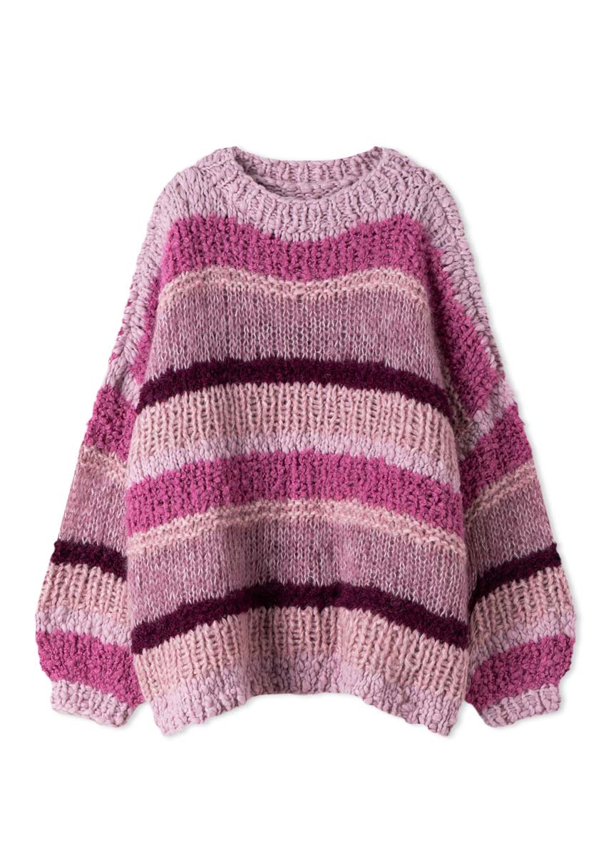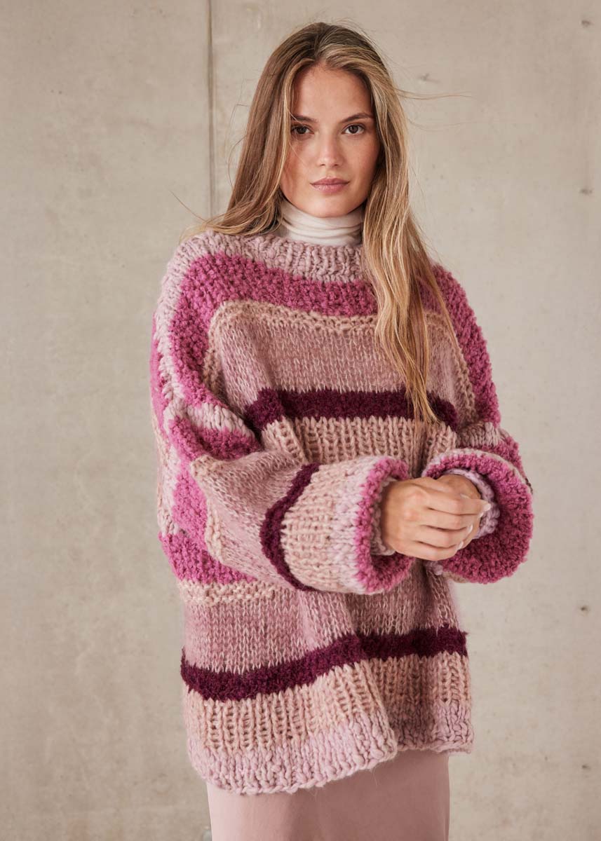 Lana Grossa Caramella (53% ny ull (merino), 25% (baby) alpakka, 22% polyamid, løpelengde 110 m/50 g), 150 g i grårosa (farge 3) og Lana Grossa Alpaca Air II (50% alpakka (baby), 27% polyamid,14% bomull, 9% ny ull (merino), løpelengde 140 m/50 g), 150 g i gammelrosa (farge 29) og Lana Grossa Orsetto (60% ny ull (merino), 40% alpakka (superfin), løpelengde 75 m/50 g), 50 g i burgunder (farge 5) og 100 g i fiolettrosa (farge 4) og Lana Grossa Silkhair (70% mohair (superkid), 30% silke, løpelengde 210 m/25 g), 50 g hver i pastellsyrin (farge 150) og mauve (farge 216); rundpinner nr. 10, 60 cm og 120 cm lang; 1 rundpinne nr. 8, 50 cm lang.