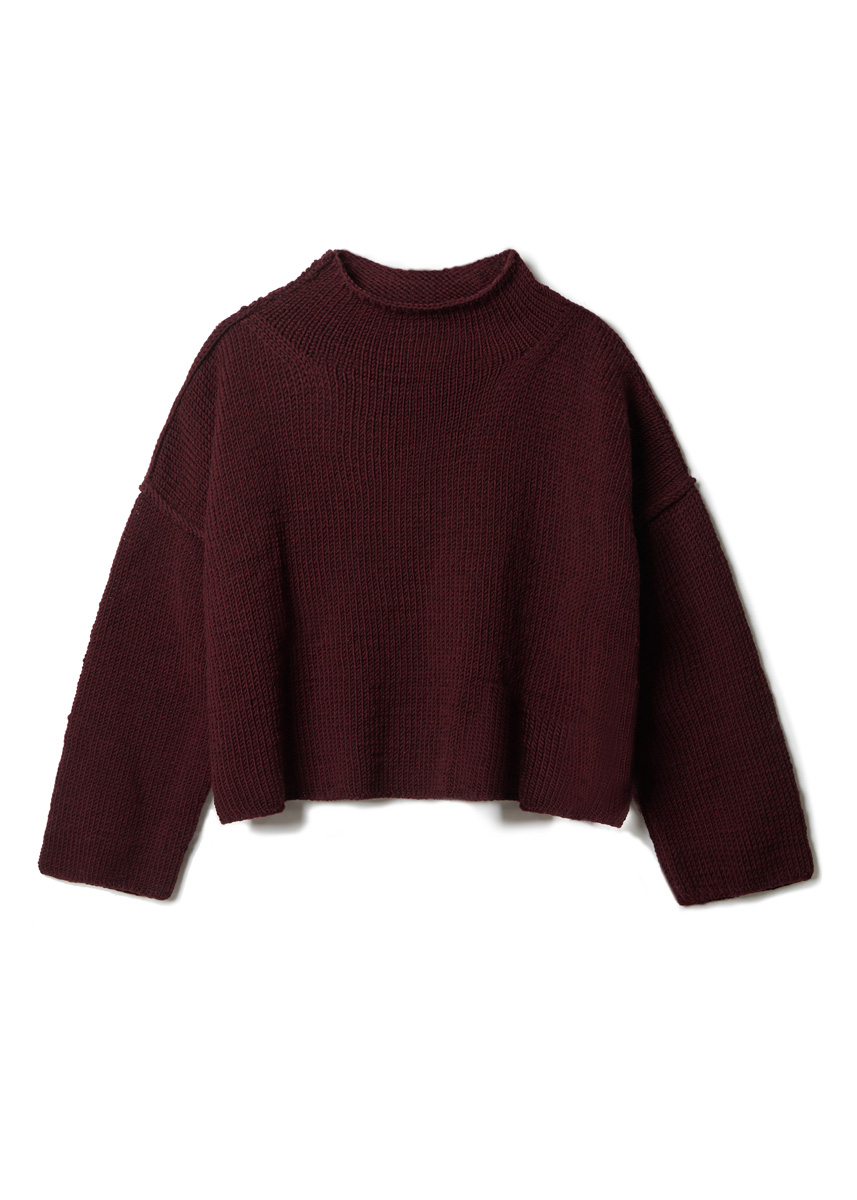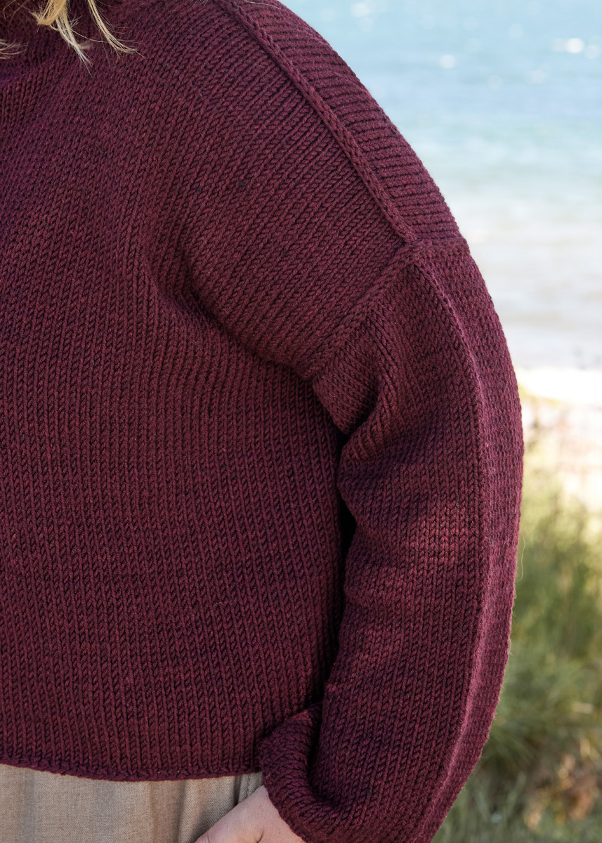 Lana Grossa Cool Wool Superbig Mélange (100% ren ny ull (merino), LL = ca. 80 m/50 g), 550 (600 – 650 – 700 – 750) g burgunder melert (frg 203) Pinner: Nr. 5 og 6, en hjelpepinne for å legge m til side