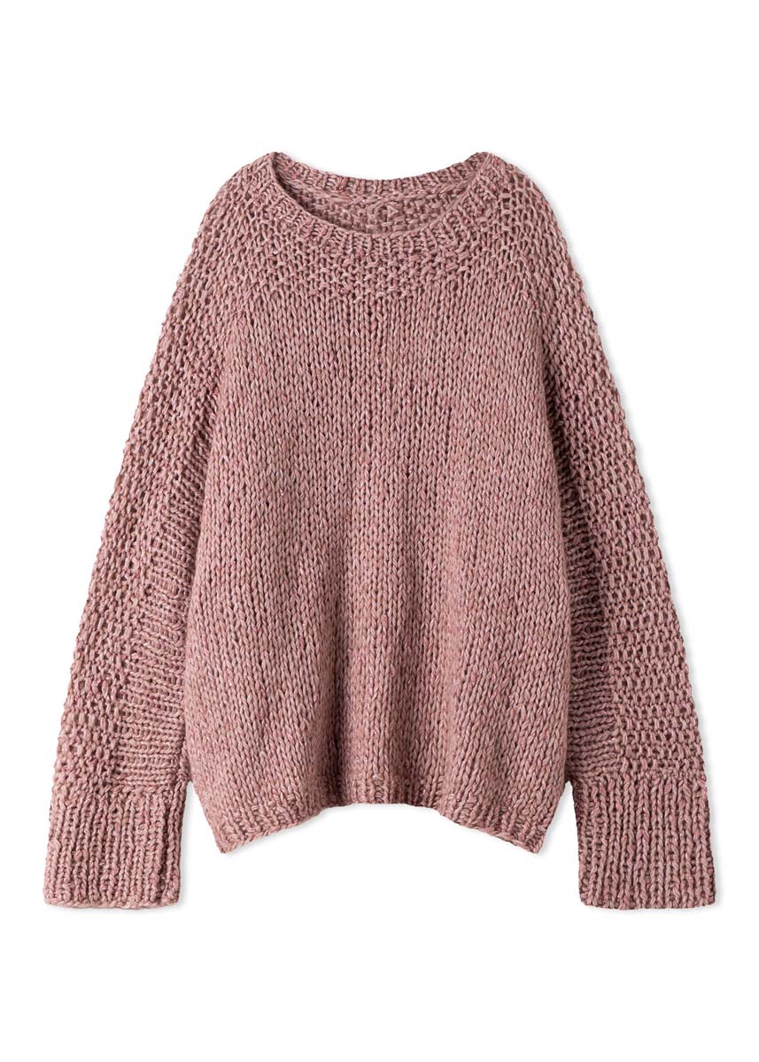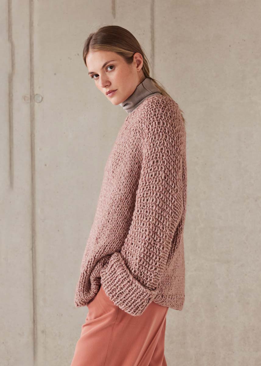 Lana Grossa Lucciola (29% polyamid, 24% ren ny ull (merino fein), 22% viskose, 20% alpakka (baby), 5% metallfiber, løpelengde 130 m/50 g), 500 (550 - 600) g i beigerosa (farge 6); strikkepinner nr. 10; 1 rundpinne nr. 12, 120 cm lang; 1 rundpinne nr. 9, 50 cm lang.
