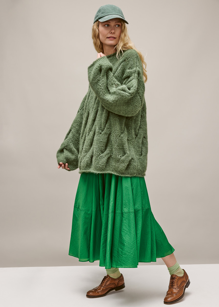 Garn: Lana Grossa Mohair di Gio (55 % mohair (superkid), 45 % ren ny ull (merino superfine), LL = 85 m/50 g): 600 (650/700/750) g resadagrønn (frg 13) Pinner: Rundpinne 6 og 7 mm, 80–100 cm lang, rundpinne 6 mm, 40 cm lang (bortfaller om det strikkes med teknikken magic loop), en flettepinne.