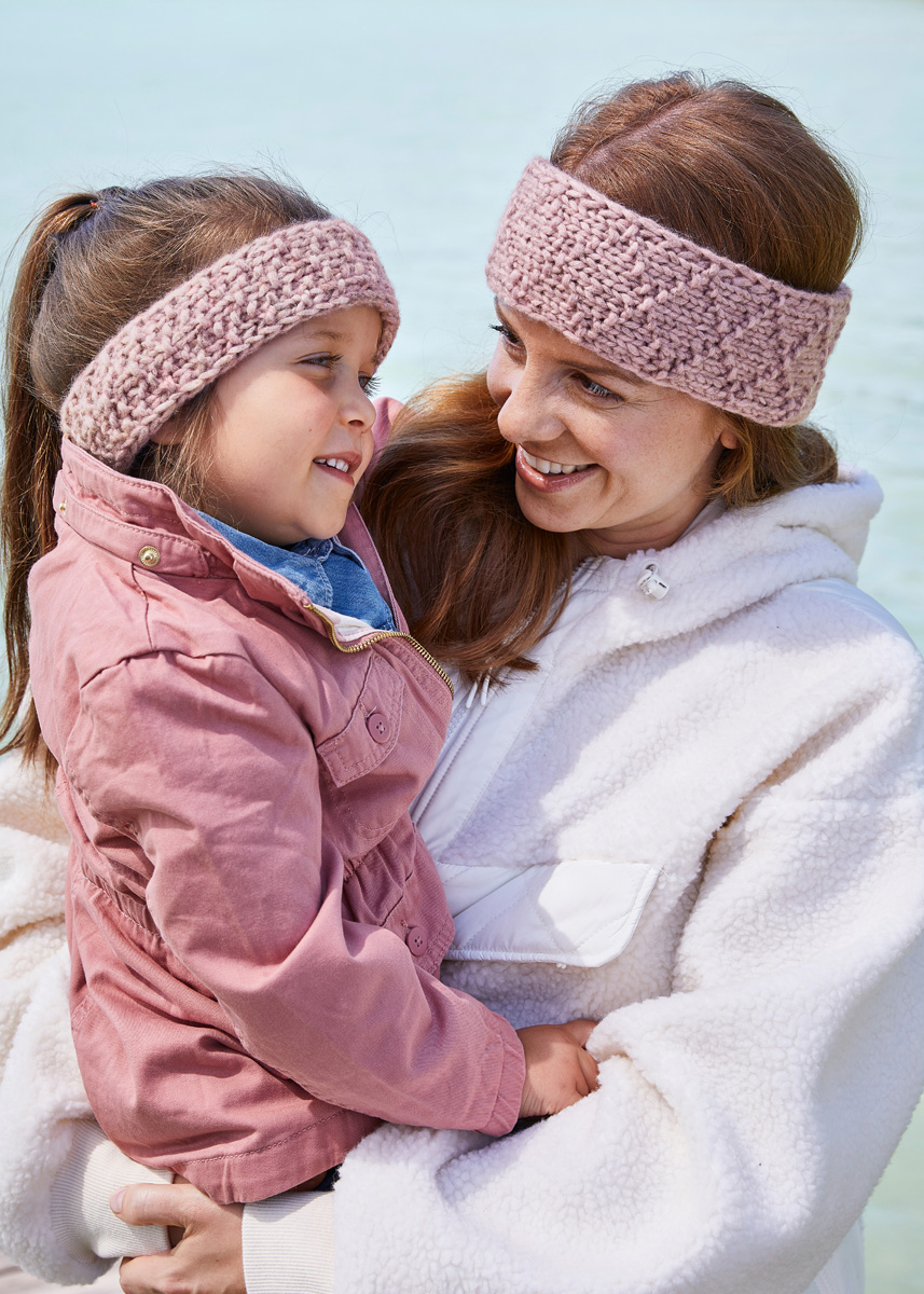 l: Lana Grossa-kvalitet „Landlust Winterwolle“ (50% ren ny ull merino, 35% bomull, 15% jak, löplängd ca. 70 m/50 g), 50 g i rosa melerad (färg 28) – räcker till båda pannbanden, restgarn i liknande grovlek, men i en kontrastfärg; strumpstickor nr. 7.