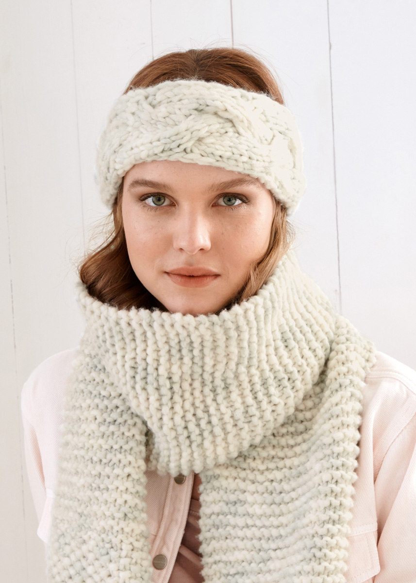„Inizio“ från Lana Grossa (54 % ren ny ull (merino), 18 % modal, 16 % polyamid, 12 % bomull, löplängd = circa 60 meter/5.0 gram), circa 50 gram råvit/silvergrå (färgnummer 102), Stickor nummer 10, 1 flätsticka.