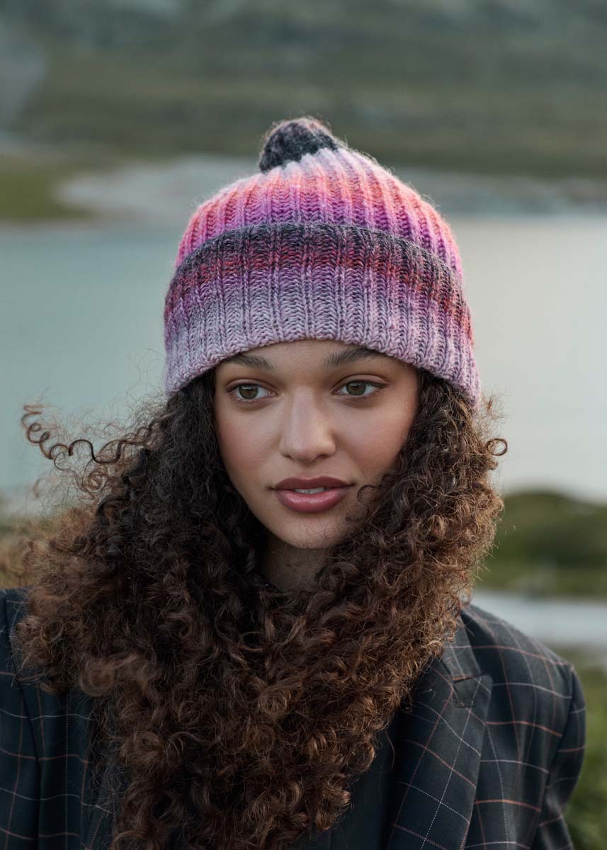 Lana Grossa-kvalitet „Gomitolo Fumo“ (50 % ren ny ull, 50 % polyacryl, løpelengde = ca 700 m/200 g): 200 g bleikrosa/rosa/pink/rødfiolett/lys-mørkgrå/terrakotta (farge 513); 1 kort rundpinne og/eller settpinner nr. 4.