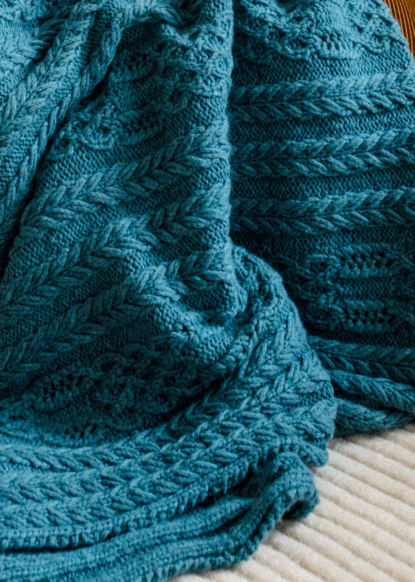 Lana Grossa-kvalitet „Alta Moda Cashmere 16” (78 % ren ny ull (merino), 12 % kashmir, 10 % polyamid, löplängd = ca. 110 m/50 g): ca. 1300 g petrol (färg 9); 1 rundsticka nr. 7, 120 cm lång.
