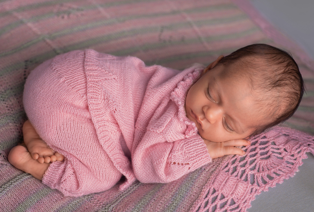 Lana Grossa-kvalitet ”Cool Wool Baby Dégradé” (100 % ren ny uld, løbelængde = ca. 220 m / 50 gr.): 200 gr rosa/nellike/lysegrå/syren (fv 508) og Lana Grossa-kvalitet ”Cool Wool Baby” (100 % ren ny uld, løbelængde = ca. 220 m / 50 gr.): 100 gr rosa (fv 216), strikkepinde nr. 3½, hæklenål nr. 3.