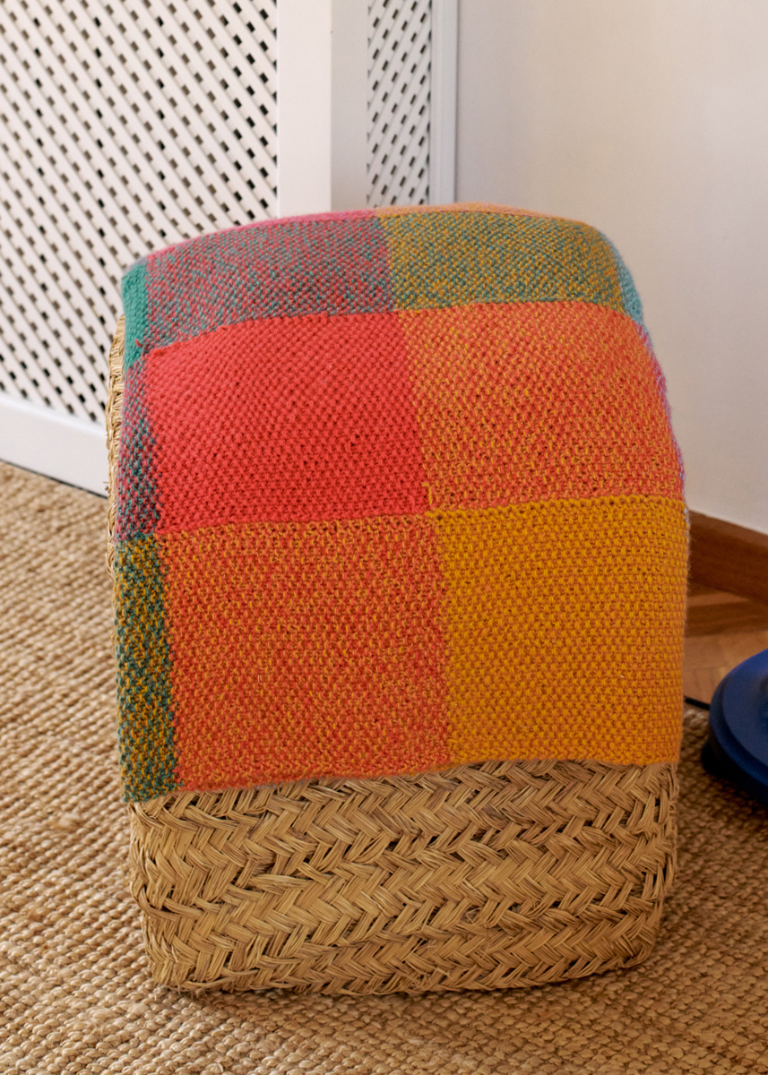 Lana Grossa-kvalitet „Ecopuno” (72 % bomull, 17 % ren ny ull (merino), 11 % (baby) alpacka, löplängd = ca. 215 m/50 g): ca. 300 g var i körsbärsröd (färg 47) och ljus jeansblå (färg 75), ca. 250 g ägggulegul (färg 80) och ca. 200 g var i hallon (färg 36), grön (färg 41) och bär (färg 40); 1 rundsticka nr. 5, 120 cm lång. St allt med dubbla trådar, 1 tråd i varje färg enl skiss.