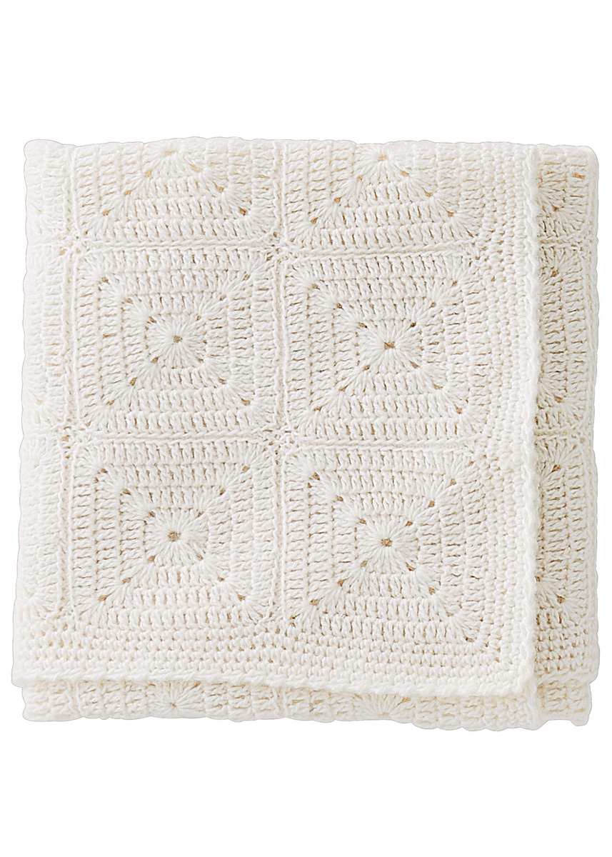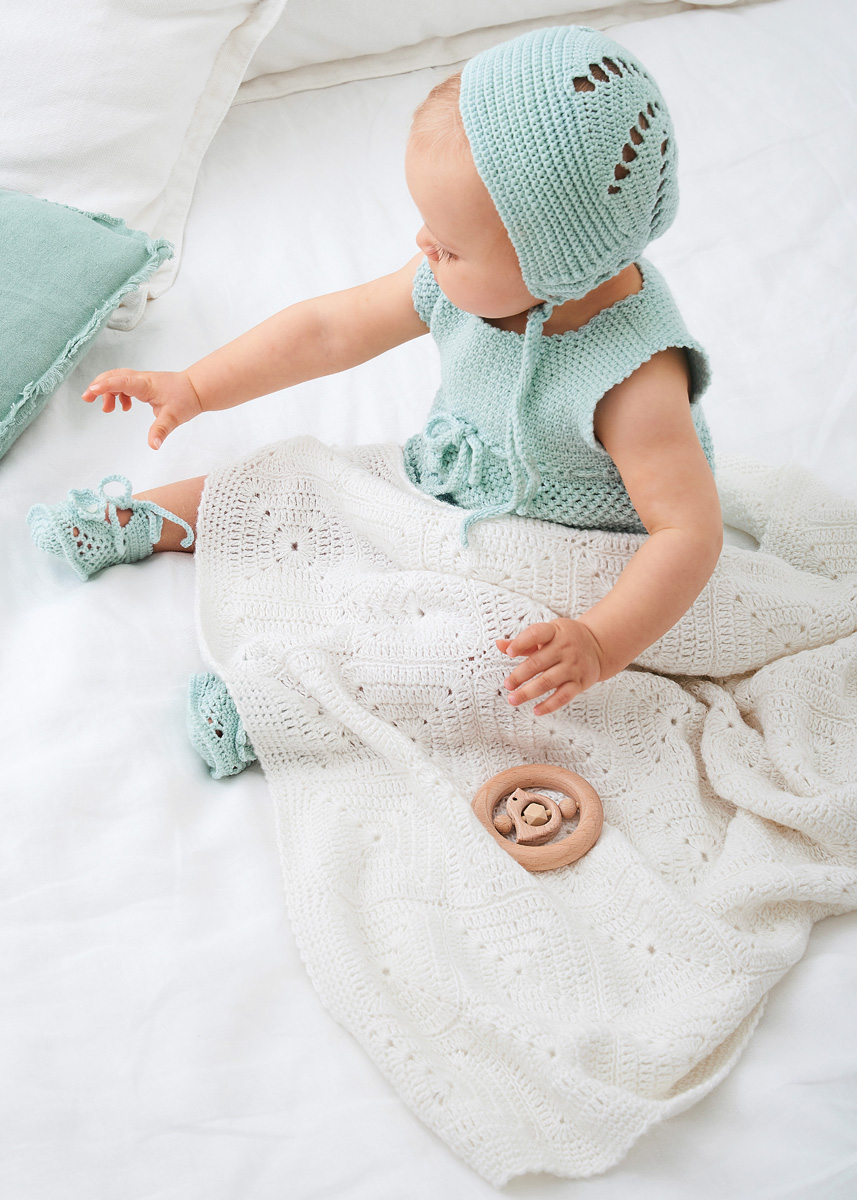 Lana Grossa-kvalitet ”Ecopuno” (72 % bomuld, 17 % ren ny (merino), 11 % alpaka (baby), løbelængde = ca. 215 m / 50 gr.): ca. 300 gr hvid (fv 26), hæklenål nr. 3½.