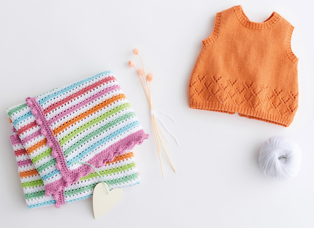 Lana Grossa-kvalitet ”Elastico” (96 % bomuld, 4 % polyester, løbelængde = ca. 160 m / 50 gr.): 100 gr hvid (fv 1), 100 gr nellike (fv 127), 50 gr stærk grøn (fv 113), 50 gr lysegrøn (fv 159), 50 gr abrikos (fv 158), 50 gr lyseblå (fv 92) og 50 gr azalea (fv 155), hæklenål nr. 3½.