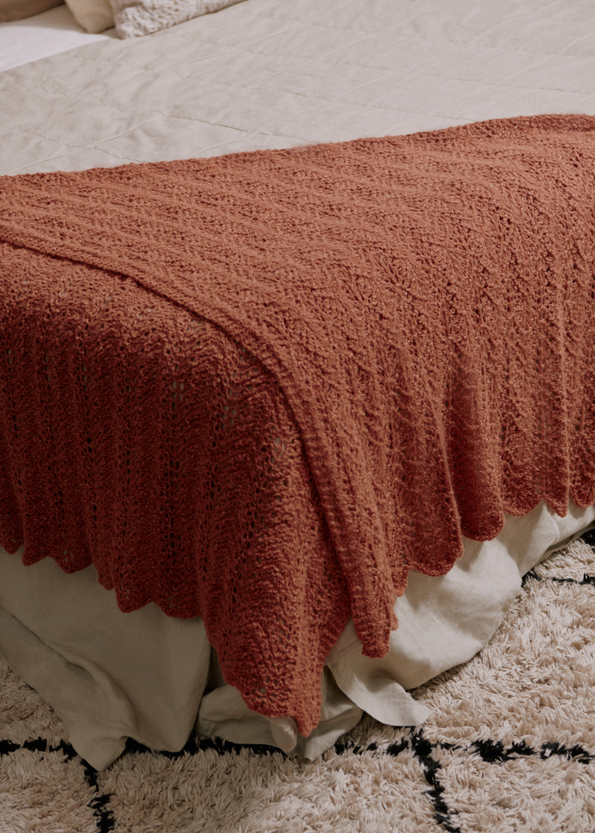 Lana Grossa-kvalitet „Fantasia“ (50 % bomull, 24 % viskos, 16 % (baby) alpacka, 10 % ren ny ull merino (extrafin), löplängd = ca. 125 m/50 g): ca. 900 g i koppar (färg 7); 1 rundsticka nr. 4, 120 cm lång.