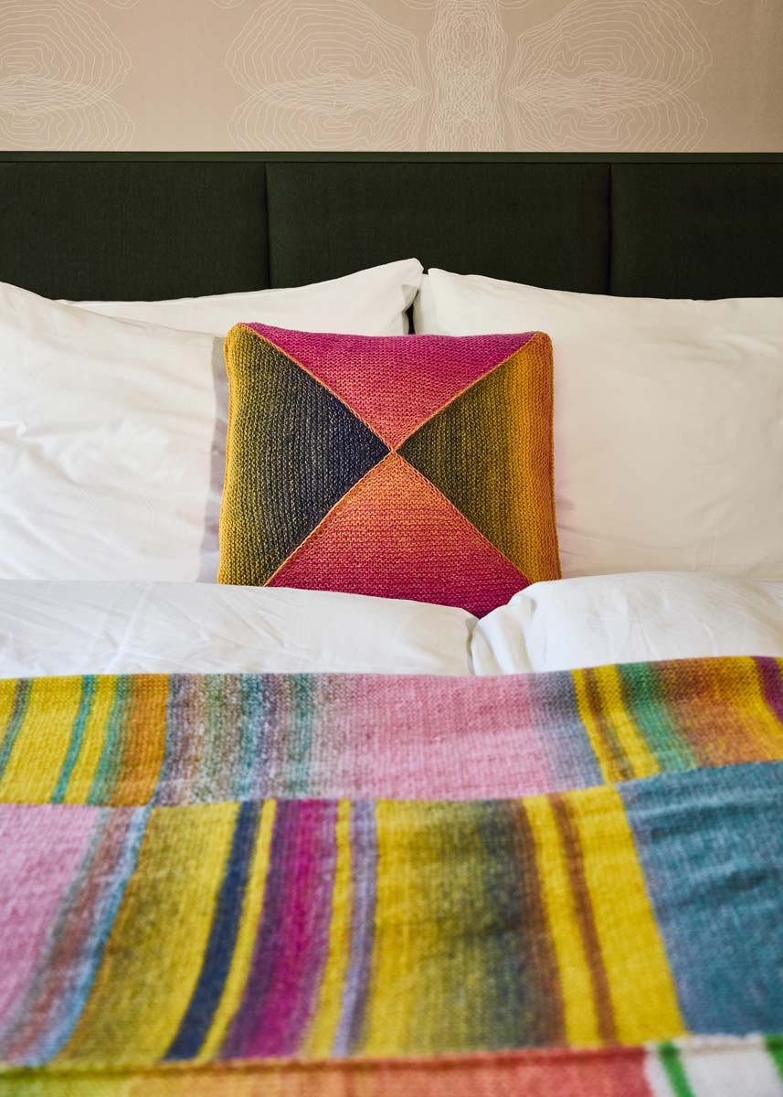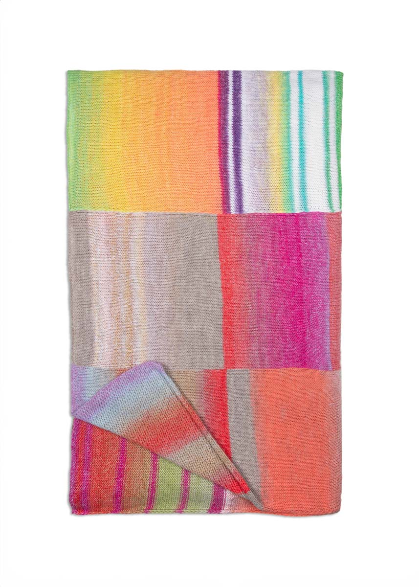 Rand A: Lana Grossa-kvalitet „Gomitolo Magico” (60 % ren ny ull, 40 % polyacryl, löplängd = ca. 700 m/200 g): ca. 200 g lysandegrön/gulgrön/gul/beige/ecru/gråviolett/bär/brun/grön/ turkos/vinröd (färg. 3027) och Lana Grossa-kvalitet „Gomitolo Versione” (60 % ren ny ull, 40 % polyacryl, löplängd = ca. 700 m/200 g): ca. 200 g hallon/hummer/orange/gul/limette/jade/ turkos/fuchsia (färg. 450) Rand B: Lana Grossa-kvalitet „Gomitolo Magico” (60 % ren ny ull, 40 % polyacryl, löplängd = ca. 700 m/200 g): ca. 200 g solgul/guldgul/kamel/grå/bär/mjukgrön/turkos/syren/grålila (färg. 3026) och Lana Grossa-kvalitet „Gomitolo Fusione” (60 % ren ny ull, 40 % polyacryl, löplängd = ca. 700 m/200 g): ca. 200 g rosa/grå/ljusblå/ljusgrön/petrol/turkos/gråbrun (färg. 2023) Rand C: Lana Grossa-kvalitet „Gomitolo Arte” (60 % ren ny ull, 40 % polyacryl, löplängd = ca. 700 m/200 g): ca. 200 g jordgubbe/rödviolett/ljusgrå/lindgrön/ljusblå/beige/orange/ röd/pink/fuchsia (färg. 1023) och Lana Grossa-kvalitet „Gomitolo Fusione” (60 % ren ny ull, 40 % polyacryl, löplängd = ca. 700 m/200 g): ca. 200 g taupe/beige/vanilj/lax/orange/gråbrun/ ljusgrå (färg. 2024); 1 rundsticka nr. 5, 80 cm lång.