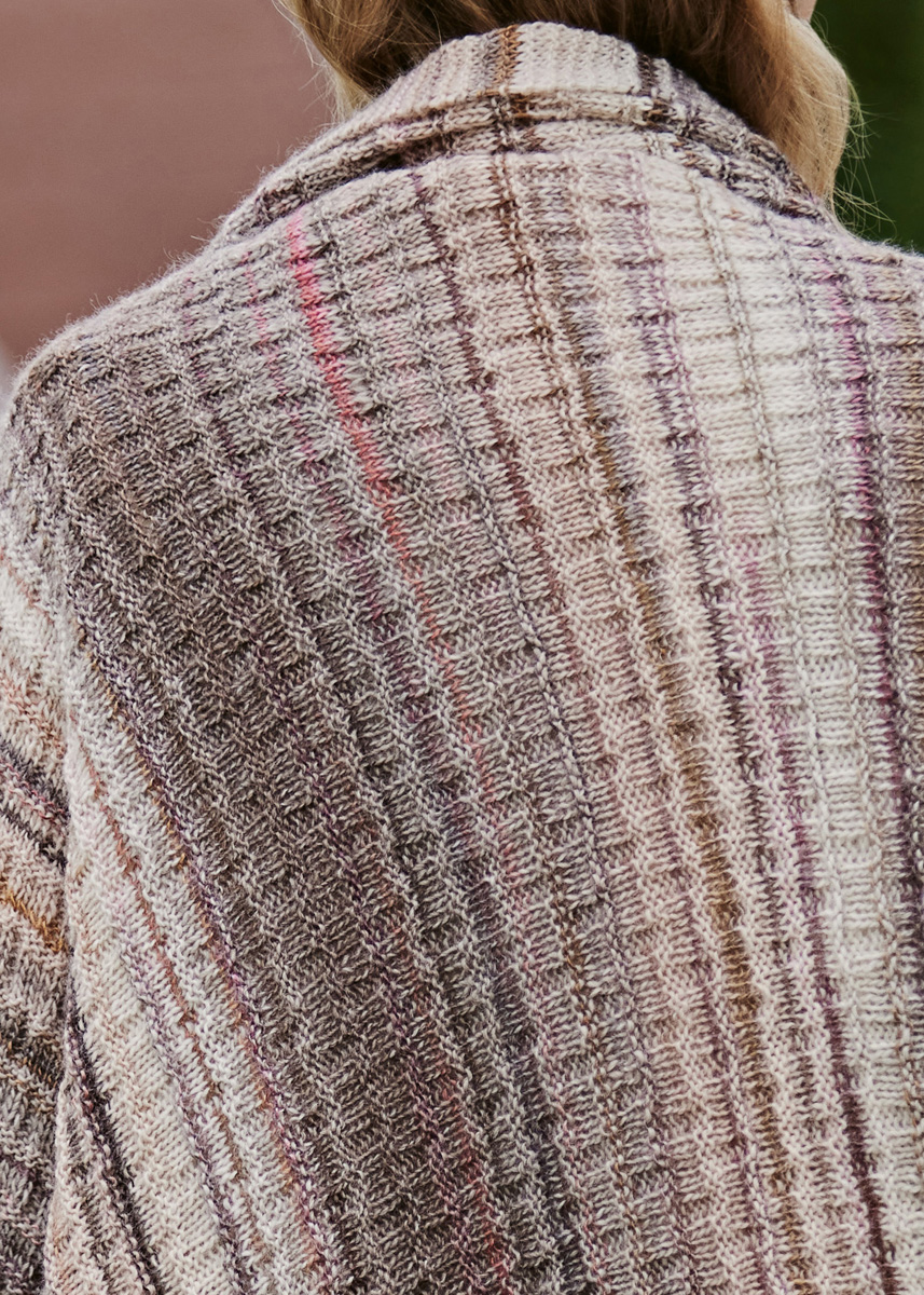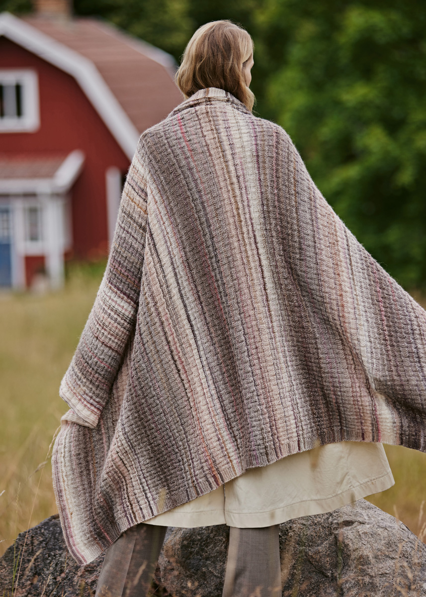 Lana Grossa-kvalitet „Gomitolo Maya“ (60 % ren ny ull, 40 % polyacryl, löplängd = ca 700 m/200 g): 600 g mörk grå/gråbrun/vinröd/ljus grå/taupe/kamel/rosabeige/rosenträ (färg 861); stickor nr. 3.
