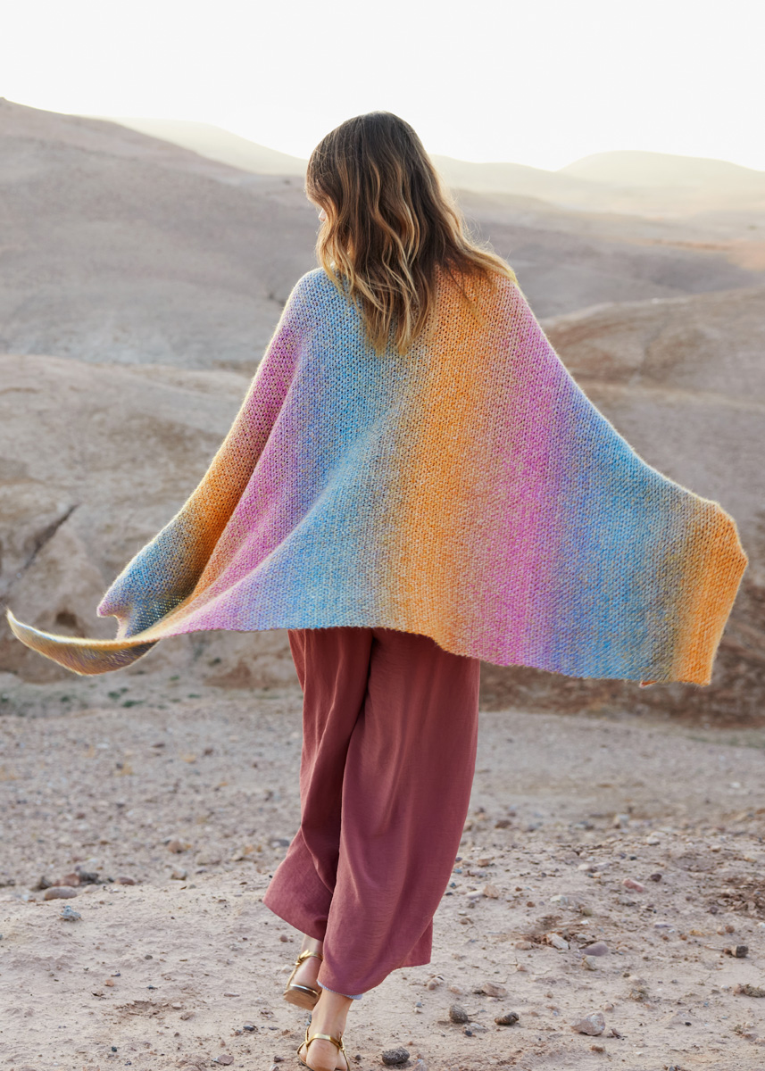 Lana Grossa-kvalitet „Gomitolo Sole“ (58 % viskos, 42 % bomull, löplängd = ca 760 m/200 g): 3 nystan = ca 600 g pink/rosa/orange/majsgul/beige/himmelsblå (färg926) och „Bella“ (35 % bomull, 30 % nylon, 25 % alpacka (baby), 10 % ren ny ull (merino), löplängd = ca 250 m/25 g): 9 nystan = ca 225 g aprikos (färg 6); virknål nr. 5. Plaiden virkas med dubbla trådar, 1 tråd av varje garnkvalitet.