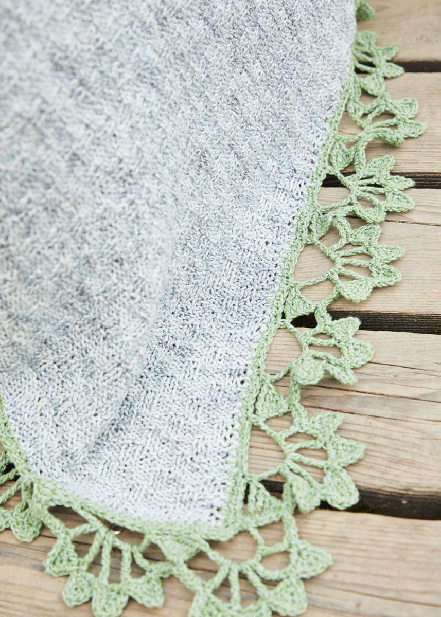 Lana Grossa-kvalitet „Landlust-Sommerseide“ (50% silke, 50% bomull, löplängd ca. 170 m/50 g), 600 g i gråblå melerad (färg 106) och 150 g i äppelgrön (färg 36); 1 rundsticka nr. 4, 100 cm lång, 1 virknål nr. 3,5.