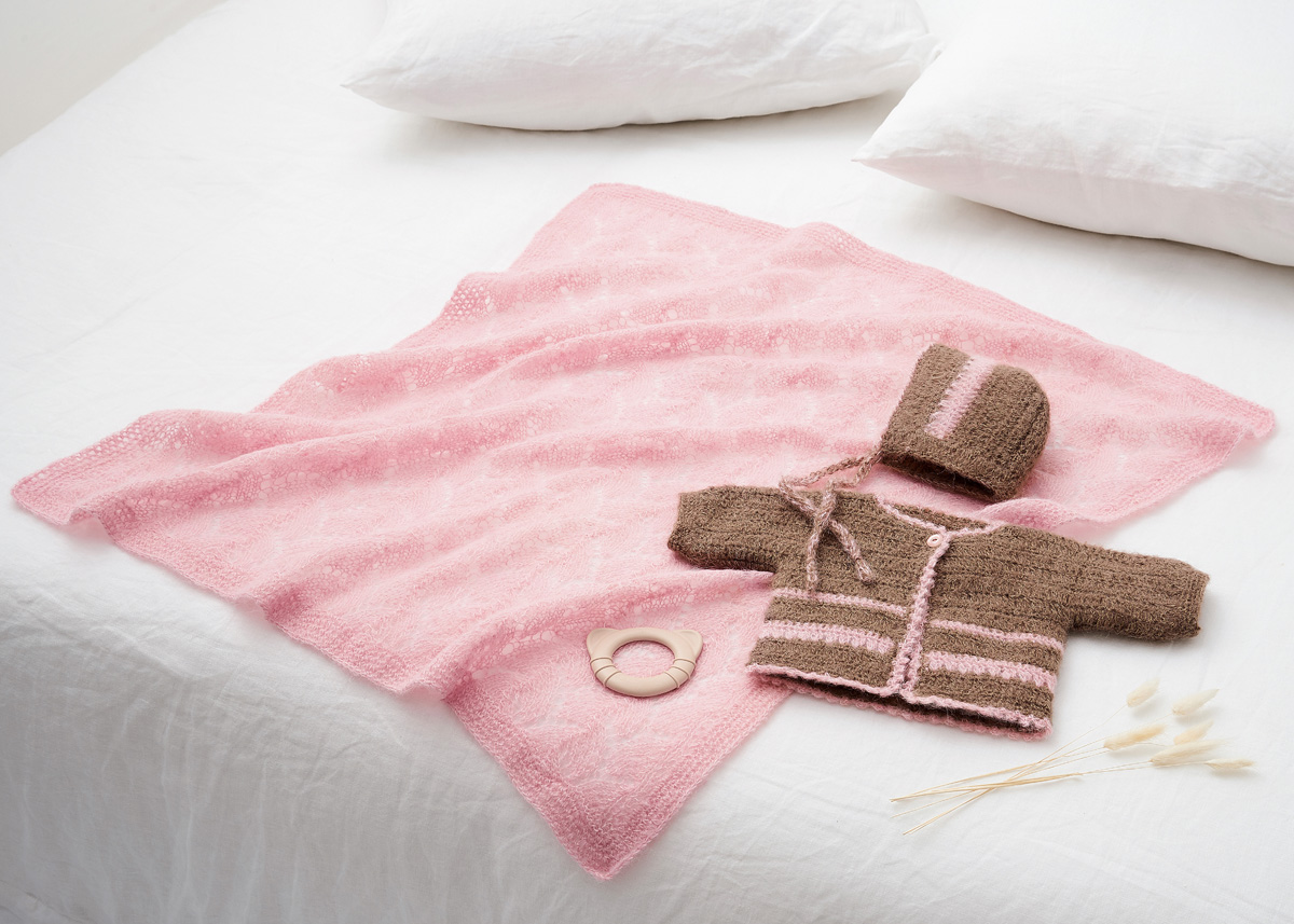 Lana Grossa-kvalitet ”Setasuri” (69 % alpaka Suri, 31 % silke, løbelængde = ca. 212 m / 25 gr.): 75 gr rosa (fv 8), strikkepinde nr. 4, hæklenål nr. 3.