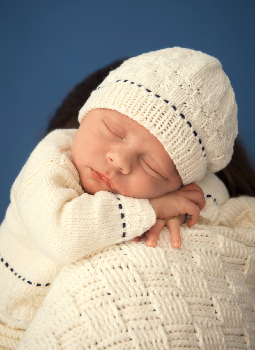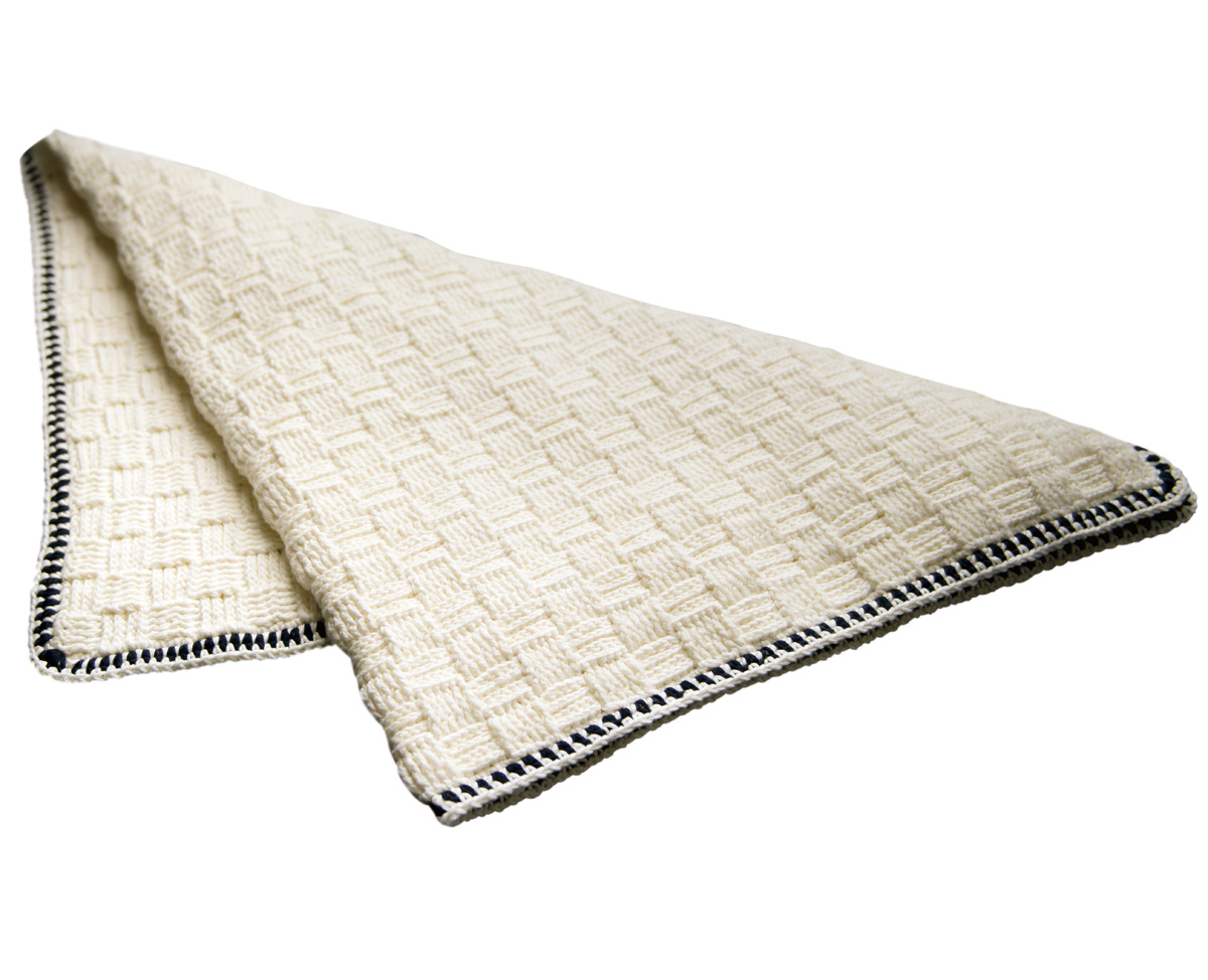 Lana Grossa-kvalitet ”Soft Cotton” (70 % bomuld, 30 % polyakryl, løbelængde = ca. 140 m / 50 gr.): 550 gr ecru (fv 2) og 50 gr natblå (fv 17), hæklenål nr. 4.