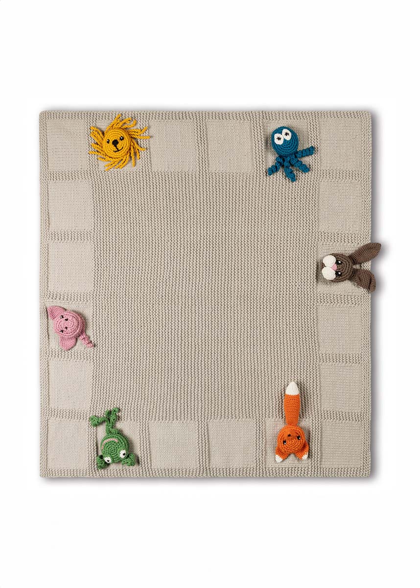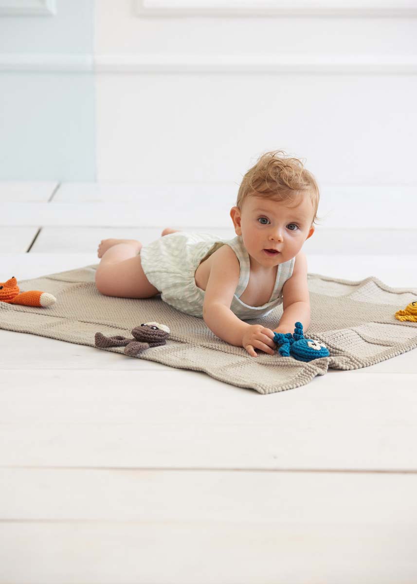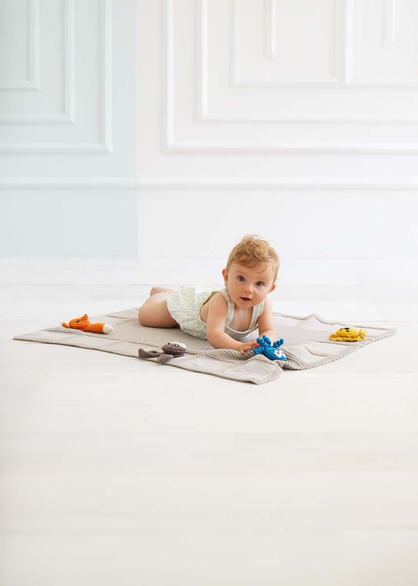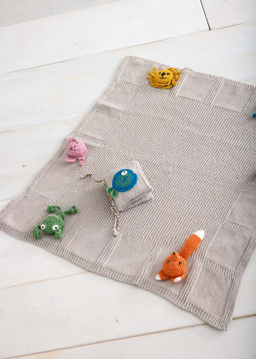 Lana Grossa The Tube Fine (68 % bomuld, 32 % polyamid, løbelængde = ca. 140 m / 100 gr.): 550 gr gråbeige (fv 115) og Cotone (100 % bomuld, kæmmet, gasset, merceriseret, løbelængde = 125 m / 50 gr): 50 gr af hver af farverne: Petrol (fv 91), majgrøn (fv 118), hvid (fv 22), gammelrosa (fv 57), mokka (fv 29), sort (fv 21), gyldengul (fv 38) og græskar (fv 39), rundpind nr. 4½, hæklenål nr. 2½ og 3½, fyldvat, 6 polstrede hårelastikker 3½ - 4 cm Ø.