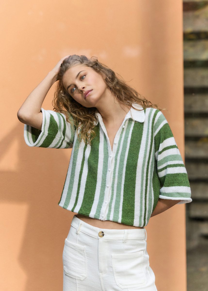 Lana Grossa-kvalitet „Ecopuno“ (72 % bomull, 17 % ren ny ull (merino), 11 % alpakka (Baby), løpelengde = ca 215 m/50 g): ca 50 (100 - 100 - 100) g resedagrønn (farge 225), ca 150 (200 - 200 - 250) g hvit (farge 26) og ca 100 (150 - 150 - 200) g gressgrønn (farge 221); pinner nr. 3 og nr. 3,5; heklenål nr. 3,5; 7 hvite knapper, diameter 10 mm.