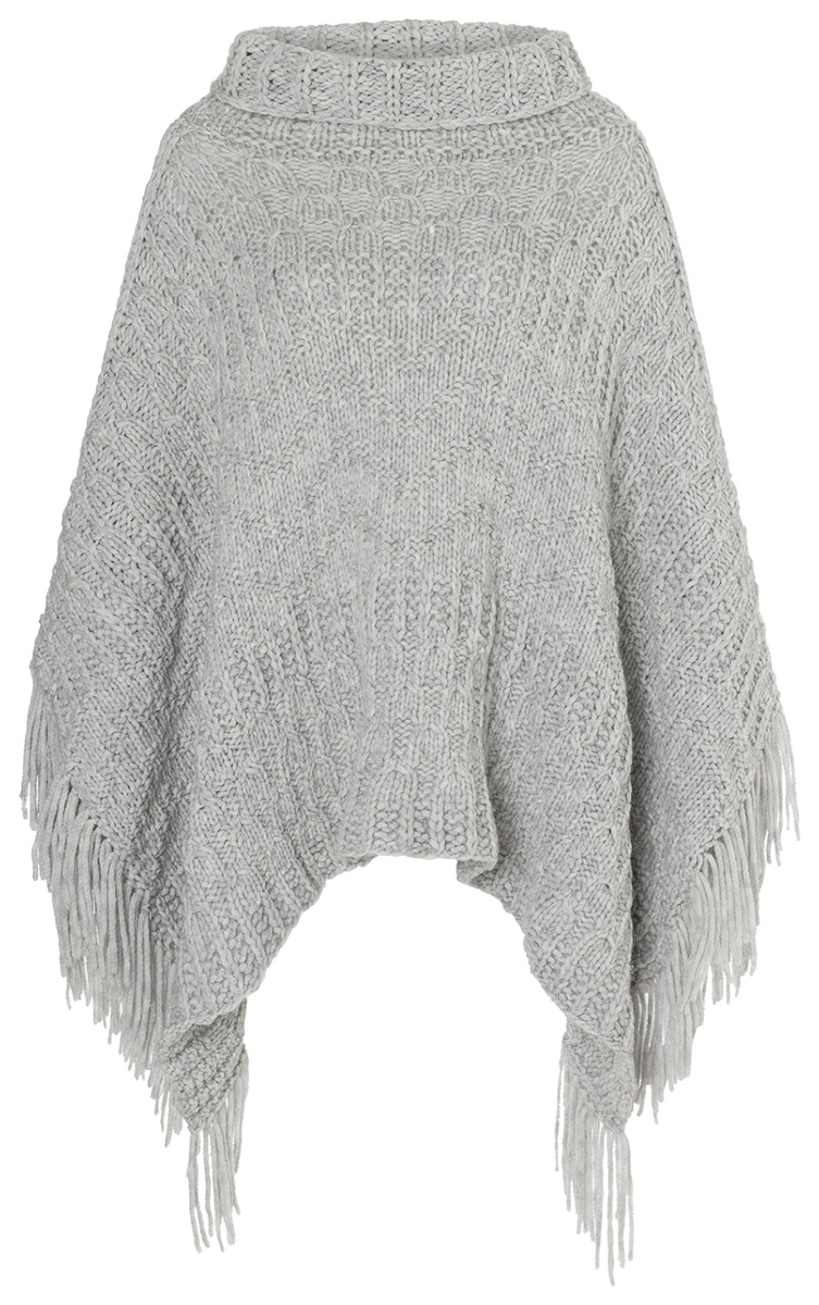 Lana Grossa-kvalitet „Alta Moda Cashmere 16” (78 % ren ny ull (merino), 12 % Kaschmir, 10 % polyamid, löplängd = ca. 110 m/50 g): ca. 600 (650) g ljus grå melerad (färg 1); rundstickor nr. 9, 50 och 100 cm lång, 1 ullnål [synål] nr. 6till fransarna.
