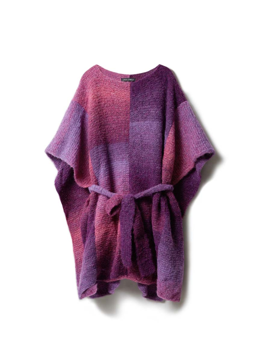 Lana Grossa-kvalitet „Avio” (63 % alpacka (Fine), 37 % polyamid, löplängd = ca. 150 m/50 g): ca. 450 (500 – 550) g blåviolett/bär (färg 17); stickor nr. 5,5.