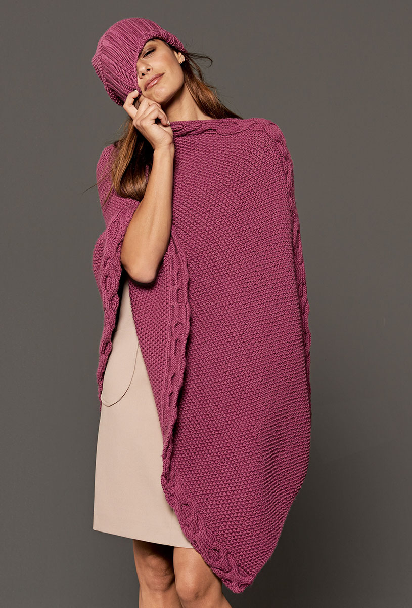 Ponchos sind unsere absoluten Lieblinge. Sie sind nun mal praktisch, sehen gut aus und mit ihnen gelingt jeder Look! Neue Akzente setzt die asymmetrische Form und der starke Pinkton. Mit von der Partie: eine Mütze, die unseren Look komplett macht.