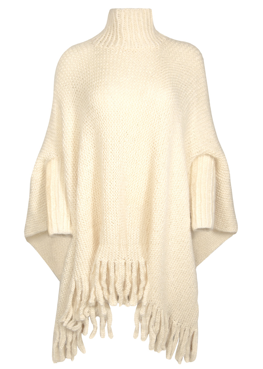 Lana Grossa-kvalitet ”Brigitte No. 2” (47 % alpaka, 45 % bomuld, 8 % ren ny uld, løbelængde = ca. 140 m / 50 gr.): ca. 800 gr råhvid (fv 16) og Lana Grossa-kvalitet ”Brigitte No. 3” (40 % mohair, 37 % ren ny uld, 23 % polyamid, løbelængde = ca. 100 m / 25 gr.): ca. 500 gr hvid (fv 20), strikkepinde nr. 6 og 7, rundpind nr. 6, 40 cm.