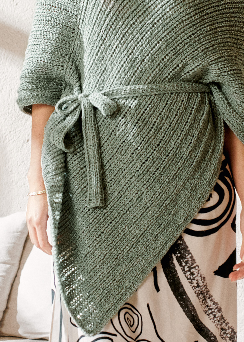 Lana Grossa-kvalitet „Cara“ (57% alpacka (baby), 33% bomull, 10% ren ny ull (merino), löplängd = ca. 120 m/50 g), 600 (700) g grågrön (färg 12); stickor nr. 3,5.