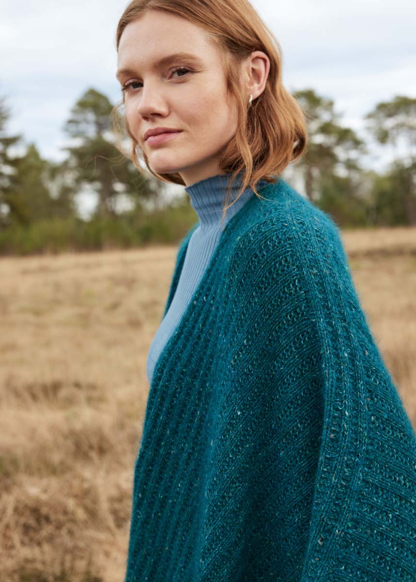 Lana Grossa Cashmere 16 Fine (80% ren ny ull (merino ekstrafin), 10% kasjmir, 10% polyamid, løpelengde 320 m/50 g), 350 g i dyphavsgrønn (farge 66) og Lana Grossa natural Superkid Tweed (60% mohair (superkid), 30% silke, 7% bomull, 3% polyester, løpelengde 200 m/25 g), 250 g i dyphavsgrønn (farge 634); 1 rundpinne nr. 4,5, 120 cm lang, settpinner nr. 4,5. Tips: Ponchoen strikkes med doble tråder med 1 tråd i natural Superkid Tweed og 1 tråd Cashmere 16 Fine!