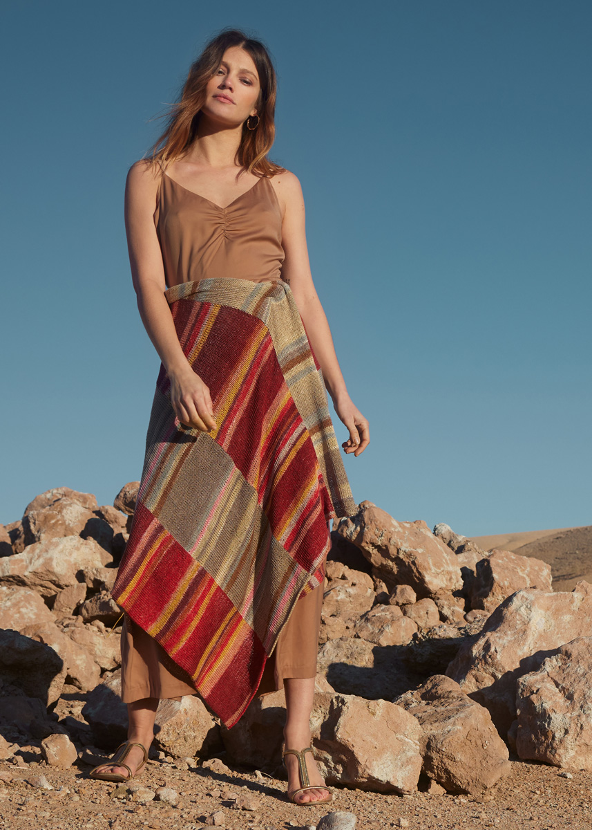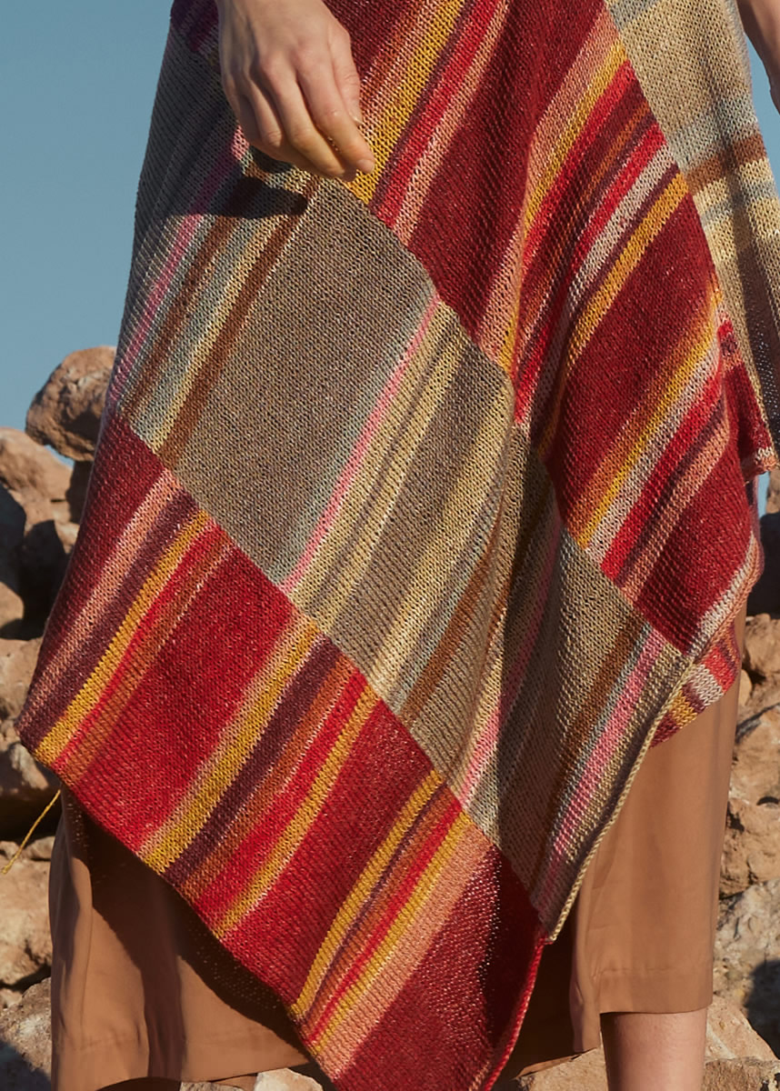 Lana Grossa-kvalitet „Gomitolo Lino“ (60 % bomull, 28 % viskos, 12 % lin, löplängd = ca 290 m/100 g): 3 nystan = ca 300 g burgund/nougat/rosabeige/rost/brunröd (färg 2014) och 3 nystan = ca 300 g beige/gråbrun/grå/rosa/natur/taupe (färg 2018a); stickor nr. 3,5.