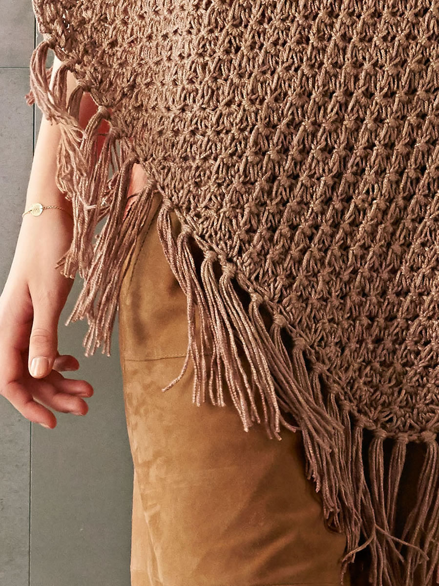 Eine geniale Sommerbasis. Denn, mit diesem Poncho ist man tagsüber und nach Sonnenuntergang gut angezogen. Ein dezentes Strukturmuster plus schwingende Fransen unter streichen den lässigen Look.