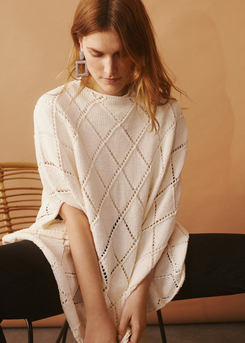 Lana Grossa „Pima“ (100% Pima-bomull; löplängd 125 m/50 g); 500 g i ecru (färg 22); stickor nr. 3,5.