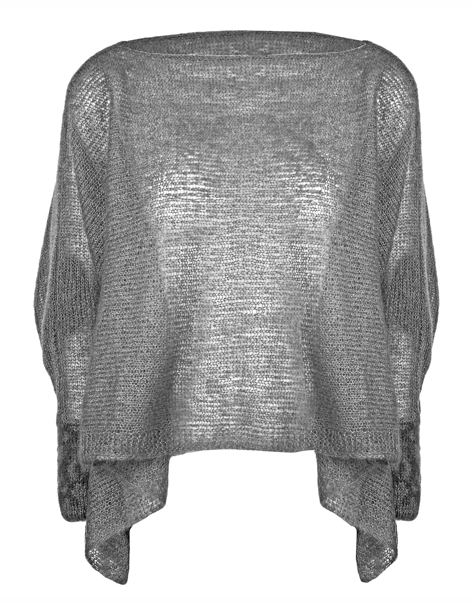 Lana Grossa-kvalitet „Silkhair“ [70% mohair (superkid), 30% silke, löplängd = ca. 210 m/25 g]; 125 g mossgrön (färg 127) och 25 g ljus oliv (färg 108) och magnolia (färg 75); stickor nr. 3 och 4