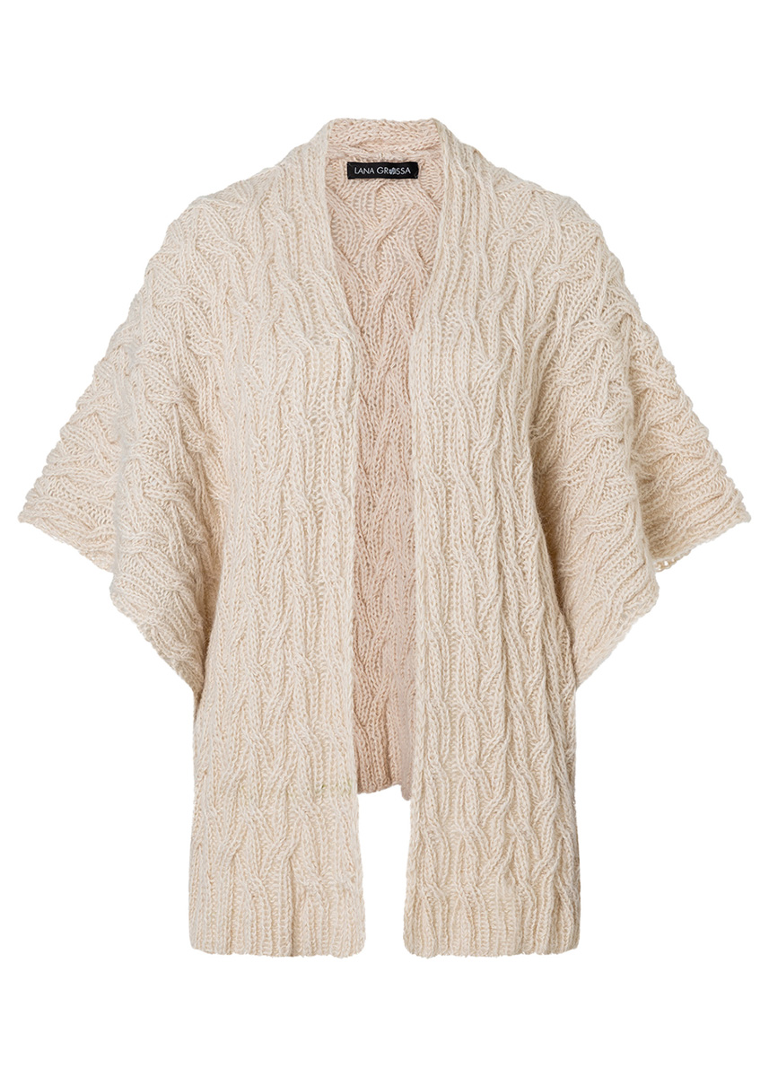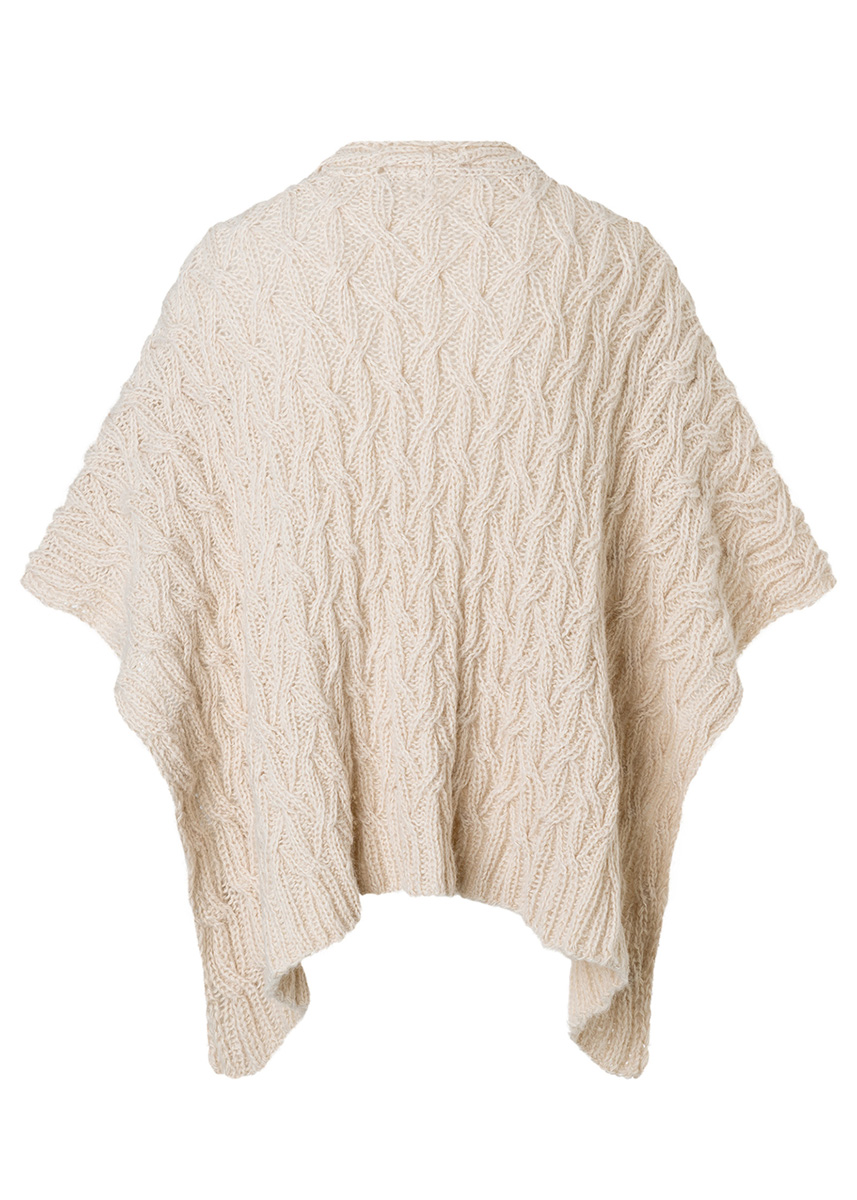 Vendbart 2-i-1-design Poncho-sjal som strikkes med dobbelt garn i et raffineret dobbeltsidet snoningsmønster.