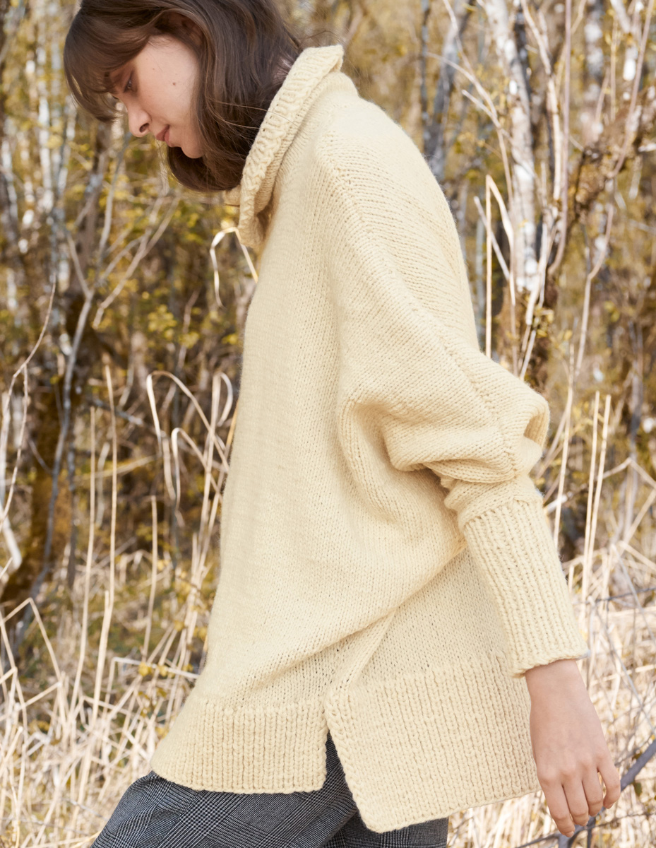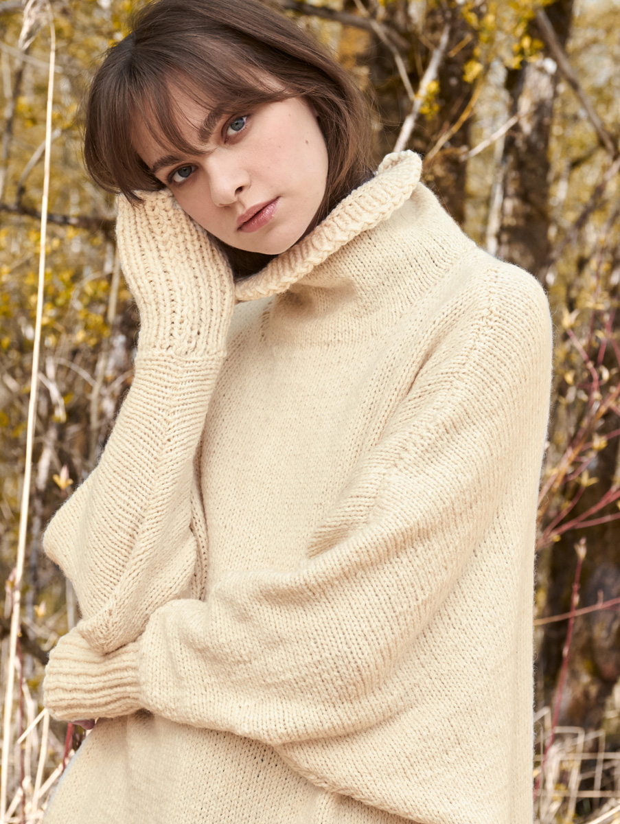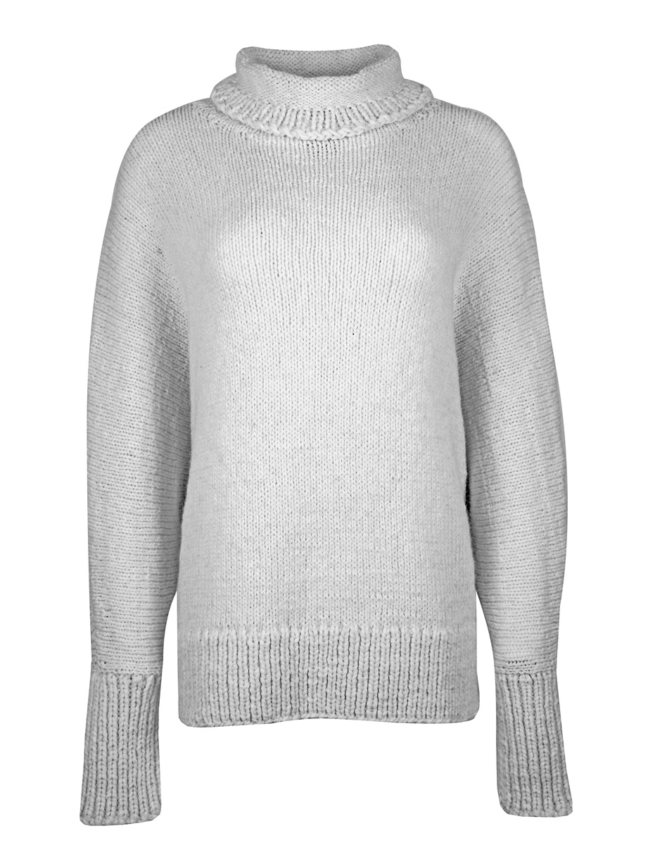 Lana Grossa Alta Moda Alpaca (90% baby alpacka, 5% virgin ull merino, 5% polyamid, löplängd 140 m/50 g), 750 (800 – 850 – 900) g råvit (färg 14); stickor nr. 6 och 7, 1 rundsticka nr. 6 och 7, 40 cm lång.