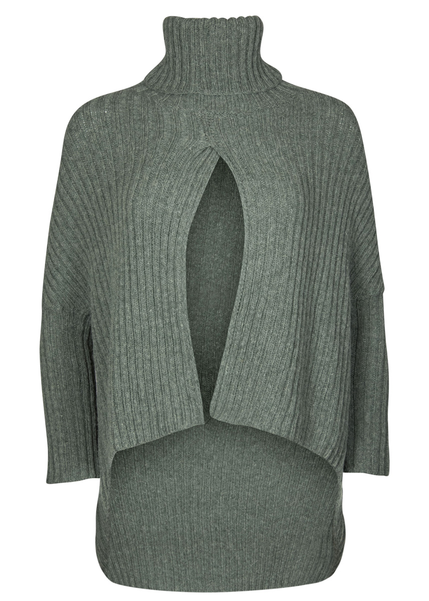 Lana Grossa Cashmere 16 Fine (80% ren ny ull, 10% kashmir, 10% polyamid, löplängd 320 m/50 g), 400 (450) g grågrön (färg 34); 1 rundsticka nr. 4,5, 40 och 80 cm lång och strumpstickor nr. 4,5, 12 maskmarkörer.