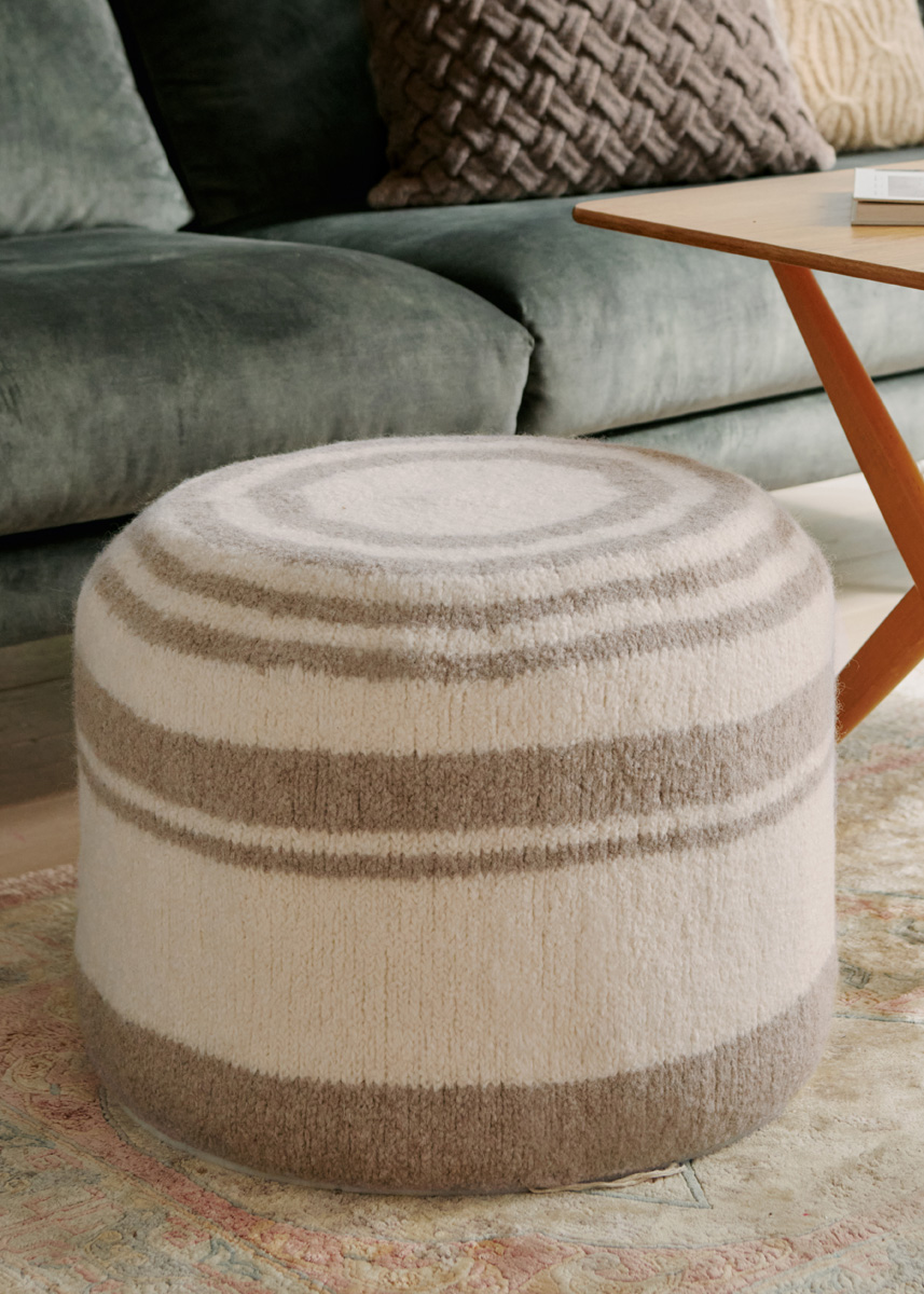 Lana Grossa-kvalitet „Feltro“ (100 % ren ny ull, löplängd = ca 50 m/50 g): ca 700 g beige (färg 24) och ca 500 g råvit (färg 1); stickor nr. 8; strumpstickor nr. 8; skumgummicylinder med en diameter av 50 cm och en höjd av 40 cm.