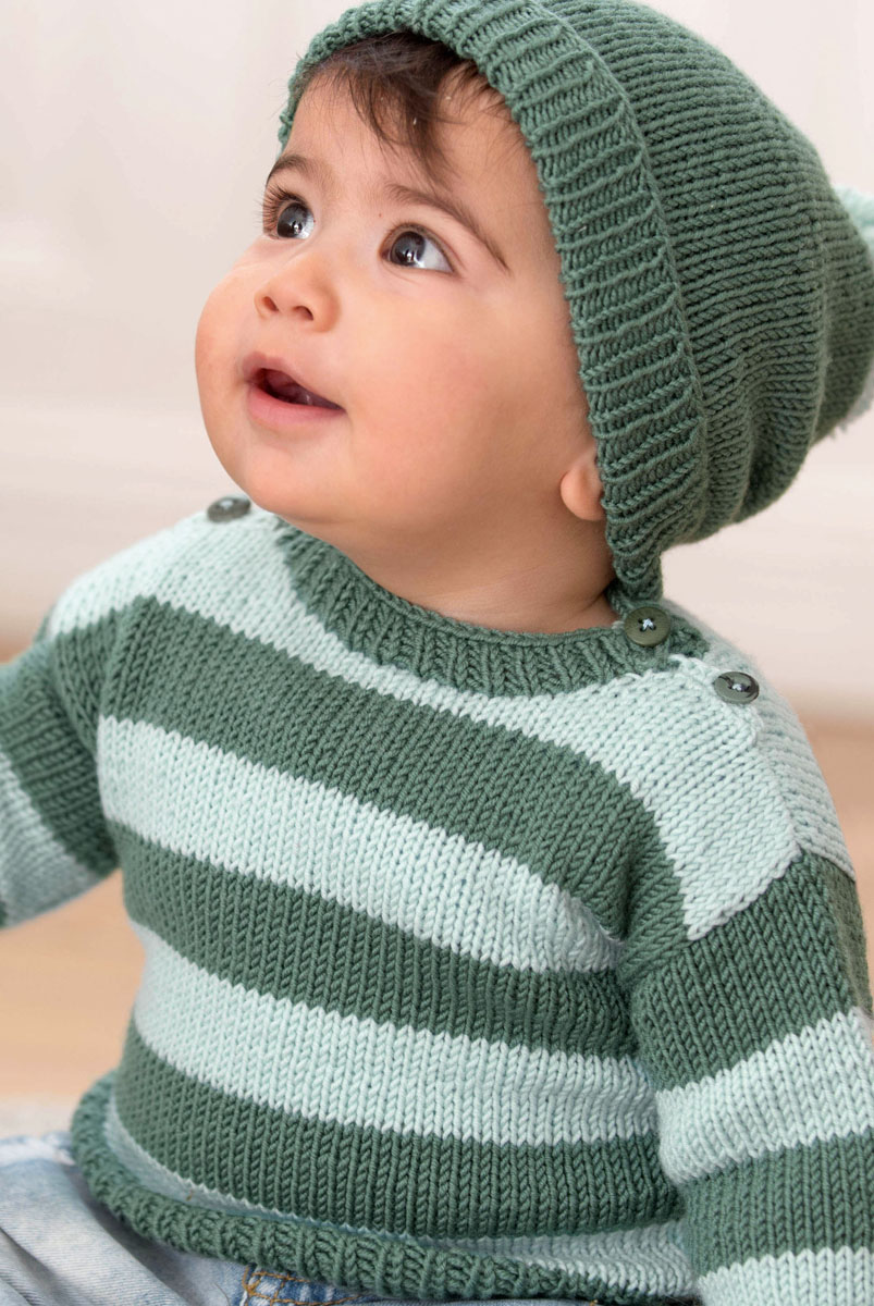 Lana Grossa Cool Wool (100 % Schurwolle, Lauflänge 160 m/50 g) 50 (50/100) g dunkles Graugrün (Fb 2021) und 50 g Helltürkis (Fb 2030); Stricknadeln Nr. 4; eine 40 cm lange Rundstricknadel Nr. 4; Häkelnadel Nr. 3,5; vier Knöpfe mit 12 mm Ø.