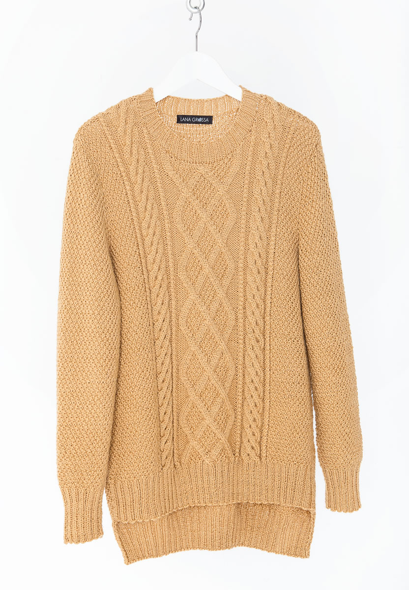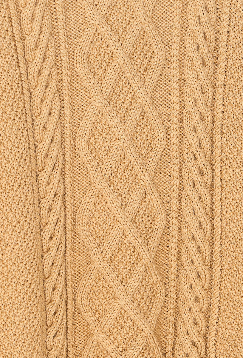 Lana Grossa-Qualität „Cool Wool Alpaca“ (70 % Schurwolle (Merino superfine), 30 % (Baby) Alpaka, Lauflänge ca. 140 m/50 g): ca. 550 (600 – 650) g Camel (Fb. 28); Stricknadeln Nr. 4 und 4,5, 1 Rundstricknadel Nr. 4, 50 cm lang.