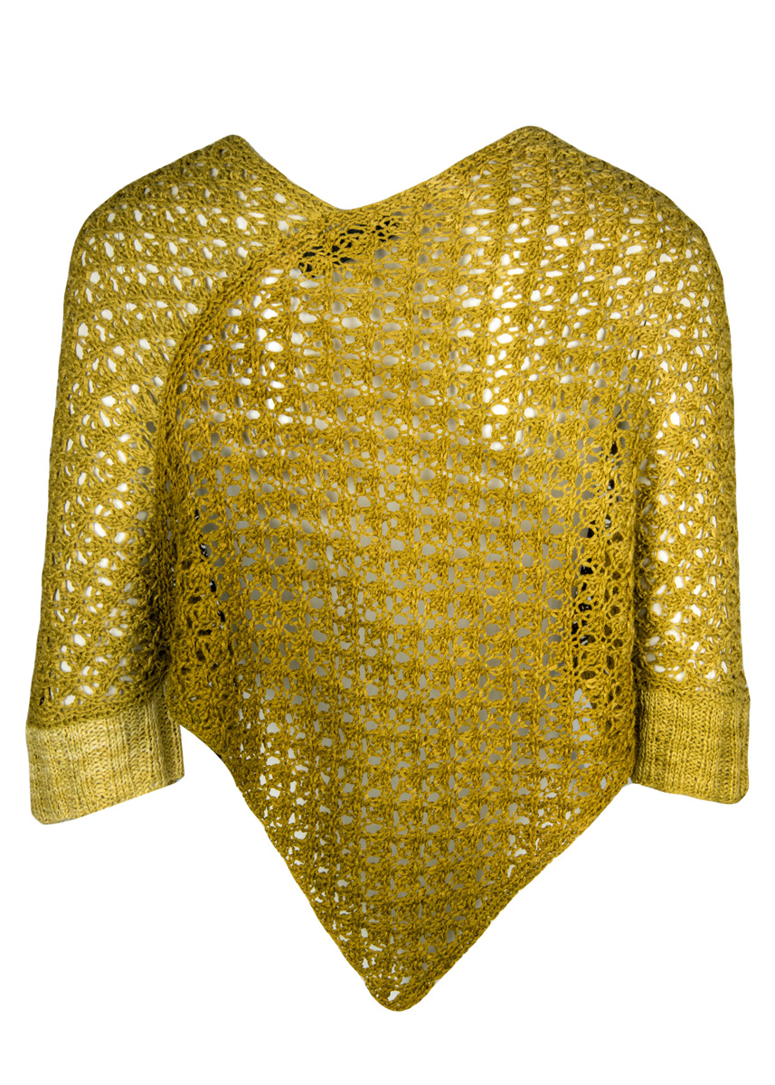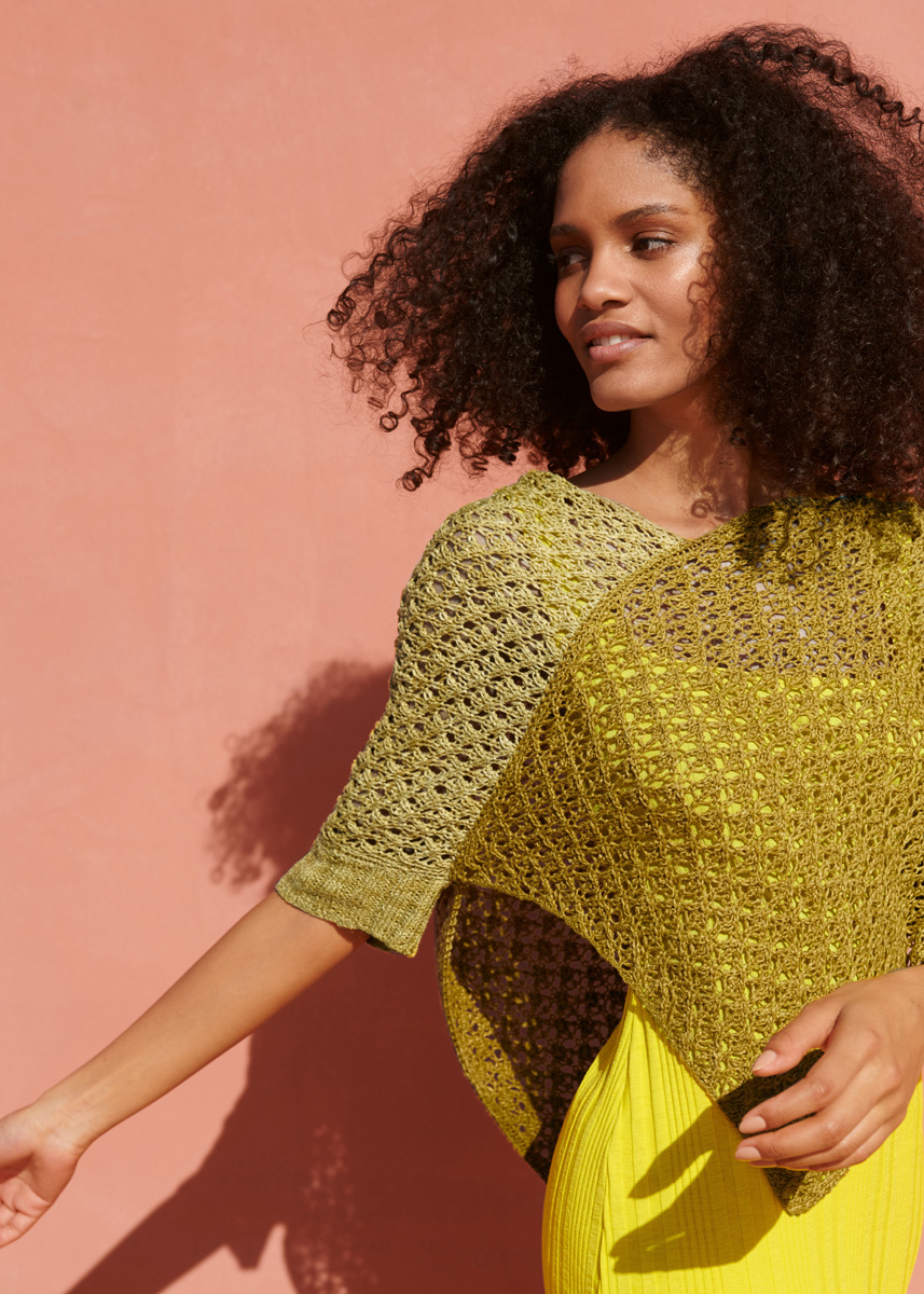 Lana Grossa-kvalitet „About Berlin Chilly Dégradé” (100 % lin, löplängd = ca. 390 m/150 g): ca. 300 g oliv graderat (färg 101); stickor nr. 4, strumpstickor nr. 3.