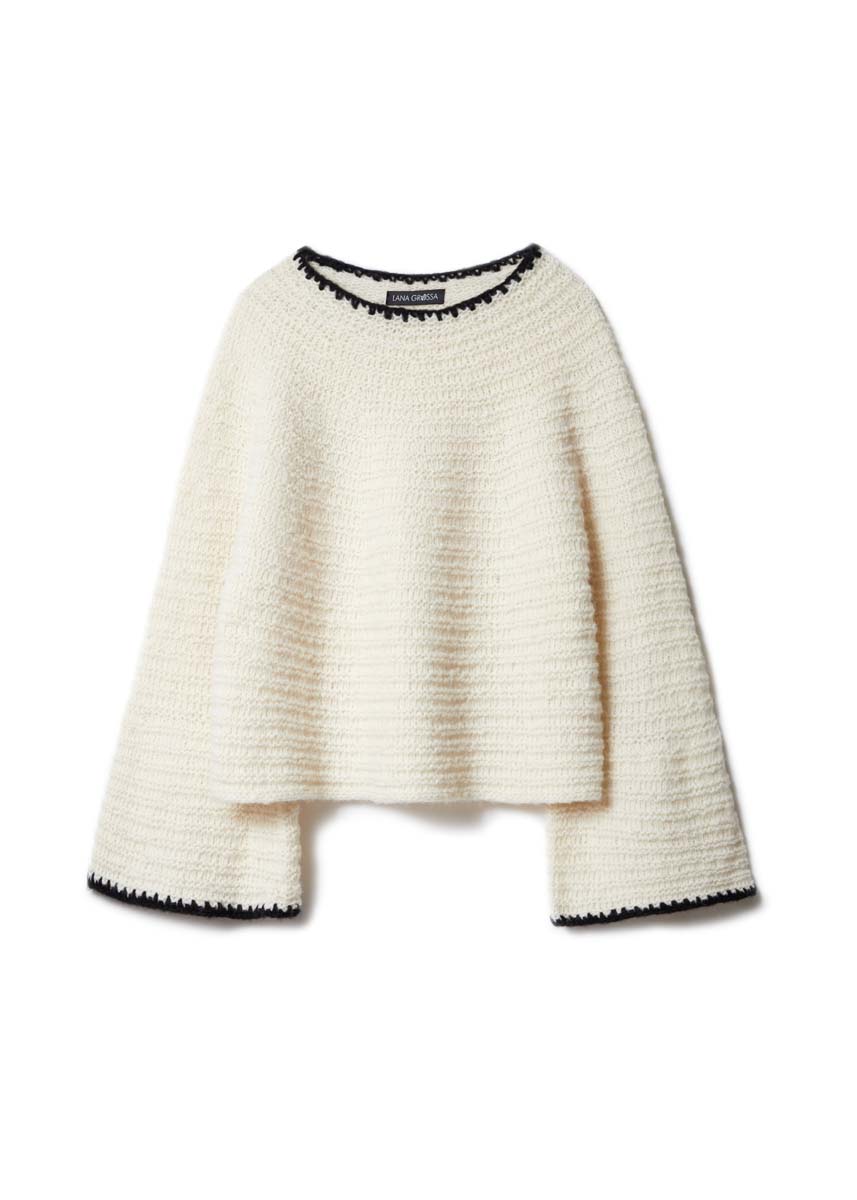 Lana Grossa-kvalitet „Airy” (42 % (baby) alpacka, 40 % bomull, 18 % ren ny ull (extrafin merino), löplängd = ca. 170 m/50 g): ca. 300 (350) g råvit (färg 13) och Lana Grossa-kvalitet „Alpaca Air” (62 % (baby) alpacka, 27 % polyamid, 11 % ren ny ull (fin merino), löplängd = ca. 140 m/50 g): ca. 50 g svart (färg 12); 1 rundsticka nr. 4, 50, 80 och 120 cm lång, strumpstickor nr. 4, 1 virknål nr. 6.