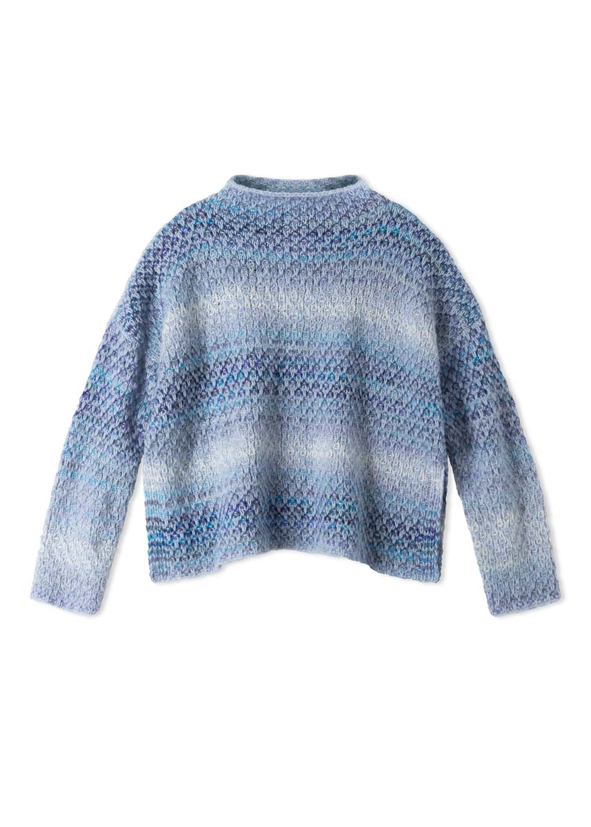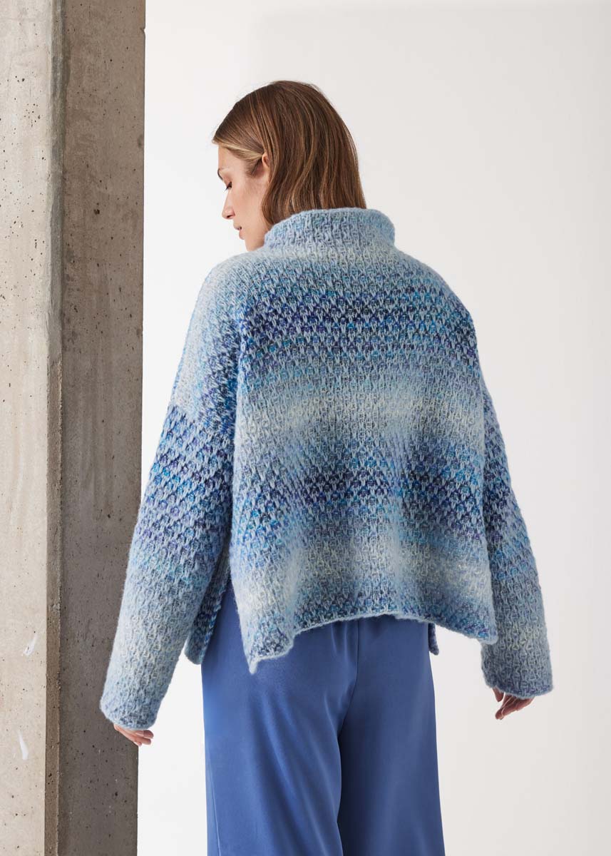Lana Grossa Airy (42% (baby) alpakka, 40% bomull, 18 % ny ull (merino ekstrafin), løpelengde = ca. 170 m/50 g), 200 (250 - 300) g i pastellblå (farge 21) og Lana Grossa Picasso (36% ny ull (merino ekstrafin), 36% (baby) alpakka, 28% polyamid, løpelengde = ca. 210 m/50 g), 150 (200 - 200) g i hvit/lysblå/gråblå/jeans/himmelblå/mørkblå (farge 13); strikkepinne nr. 6; eine 50 cm lang rundpinne nr. 6; 2 hjelpepinne til hvilende m.