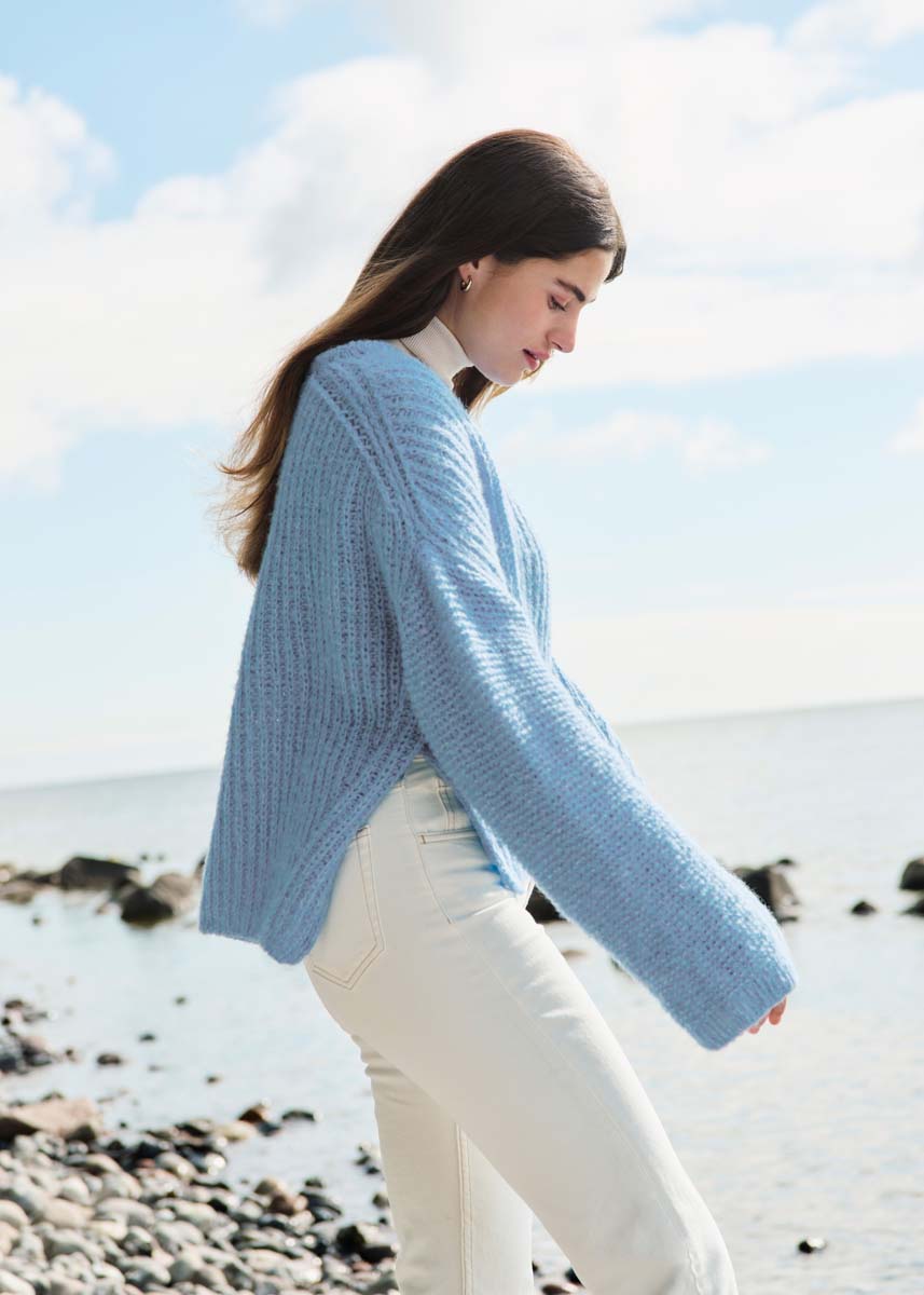 Lana Grossa-kvalitet „Airy” (42 % (baby) alpacka, 40 % bomull, 18 % ren ny ull (extrafin merino), löplängd = ca. 170 m/50 g): ca. 300 (350) g ljusblå (färg 3); stickor nr. 5 och 5,5, 1 rundsticka nr. 5, 50 cm lång.