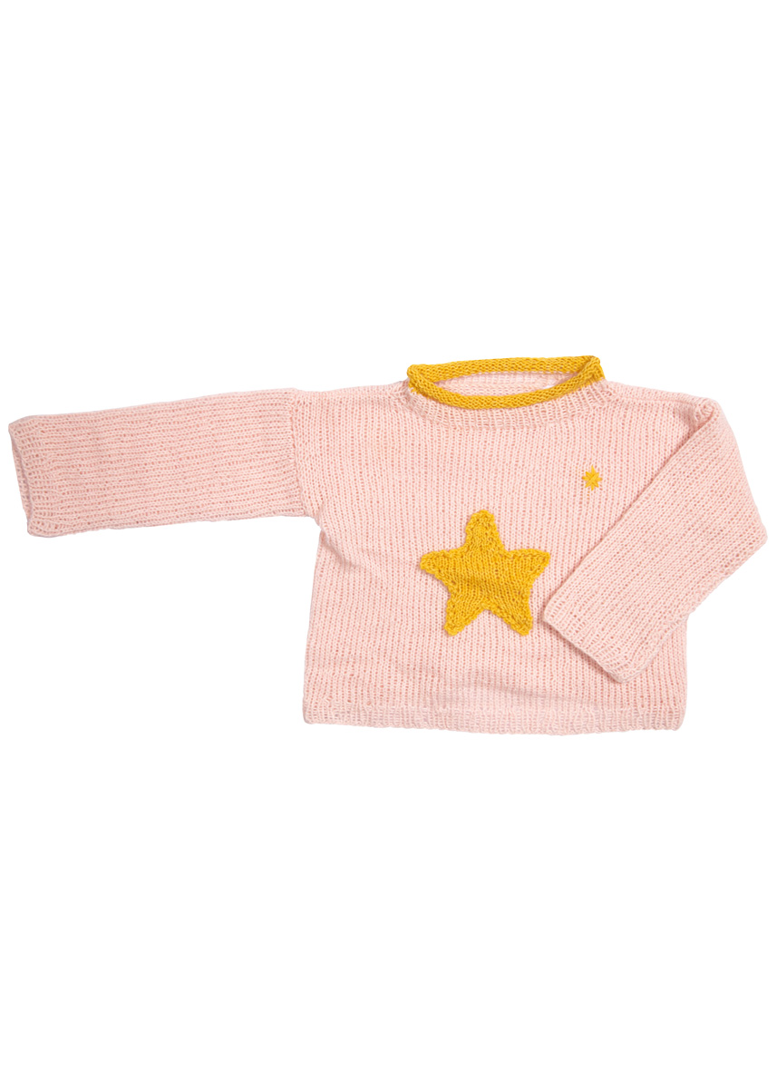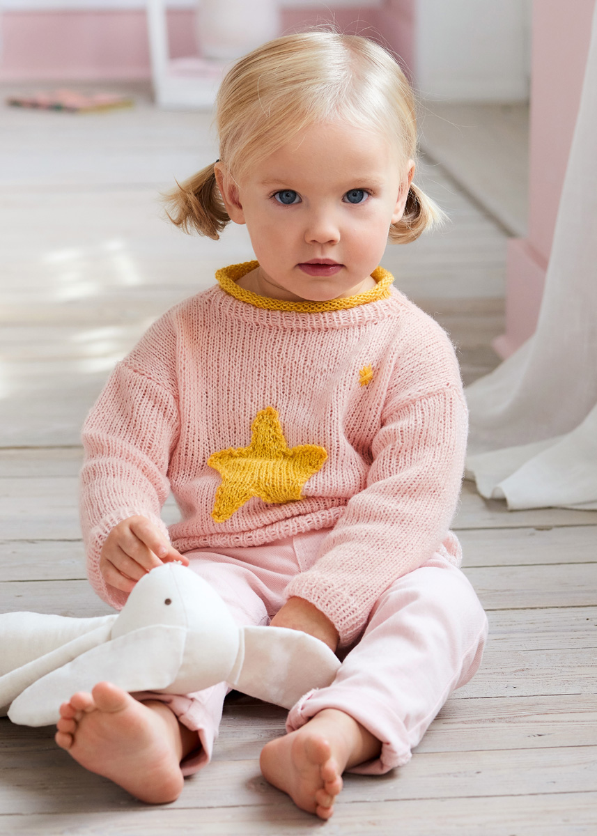 Lana Grossa-kvalitet ”Allora” (76 % bomuld, 14 % ren ny uld (merino superfine), 10 % alpaka (baby)), løbelængde = ca. 300 m / 50 gr.): 50(50-100) gr pastelrosa (fv 15) og 50 gr gul (fv 1), strikkepinde nr. 3½, rundpind nr. 3½, 40 cm, hæklenål nr. 3.