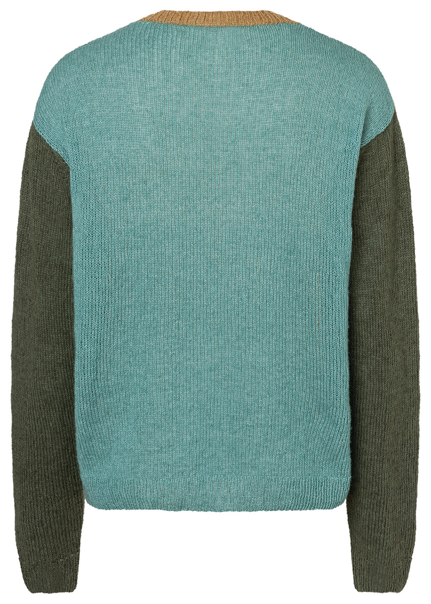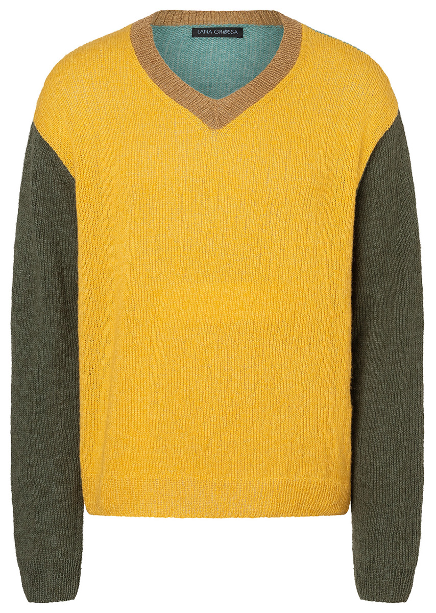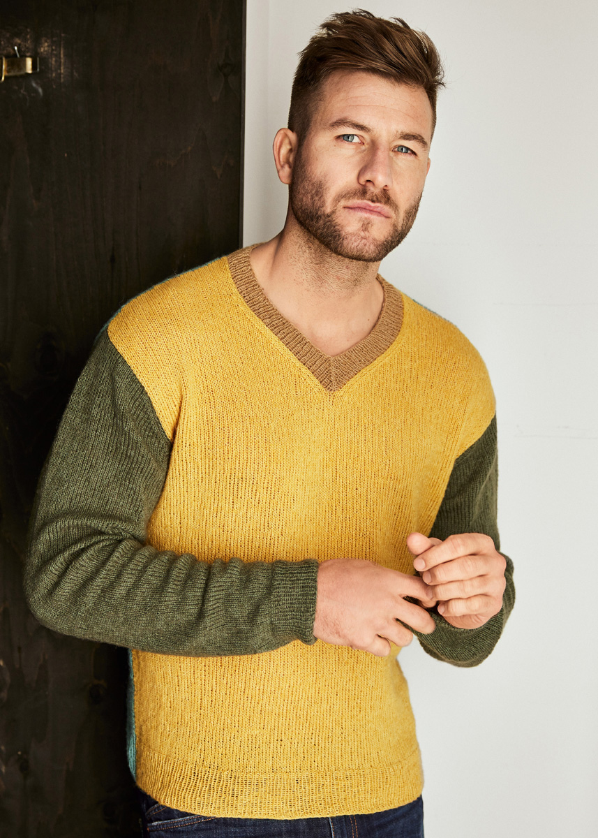 Lana Grossa Allora (76% bomull, 14% ren ny ull (merino superfin), 10% alpacka (baby), löplängd 300 m/50 g), 100 (150 – 150) g gul (färg 1), 100 (150 – 150) g mörk grön (färg 4), 100 (150 – 150) g turkos (färg 5) och 50 g kamel (färg 22); stickor nr. 3 och 3,5, 1 rundsticka nr. 3, 40 cm lång.
