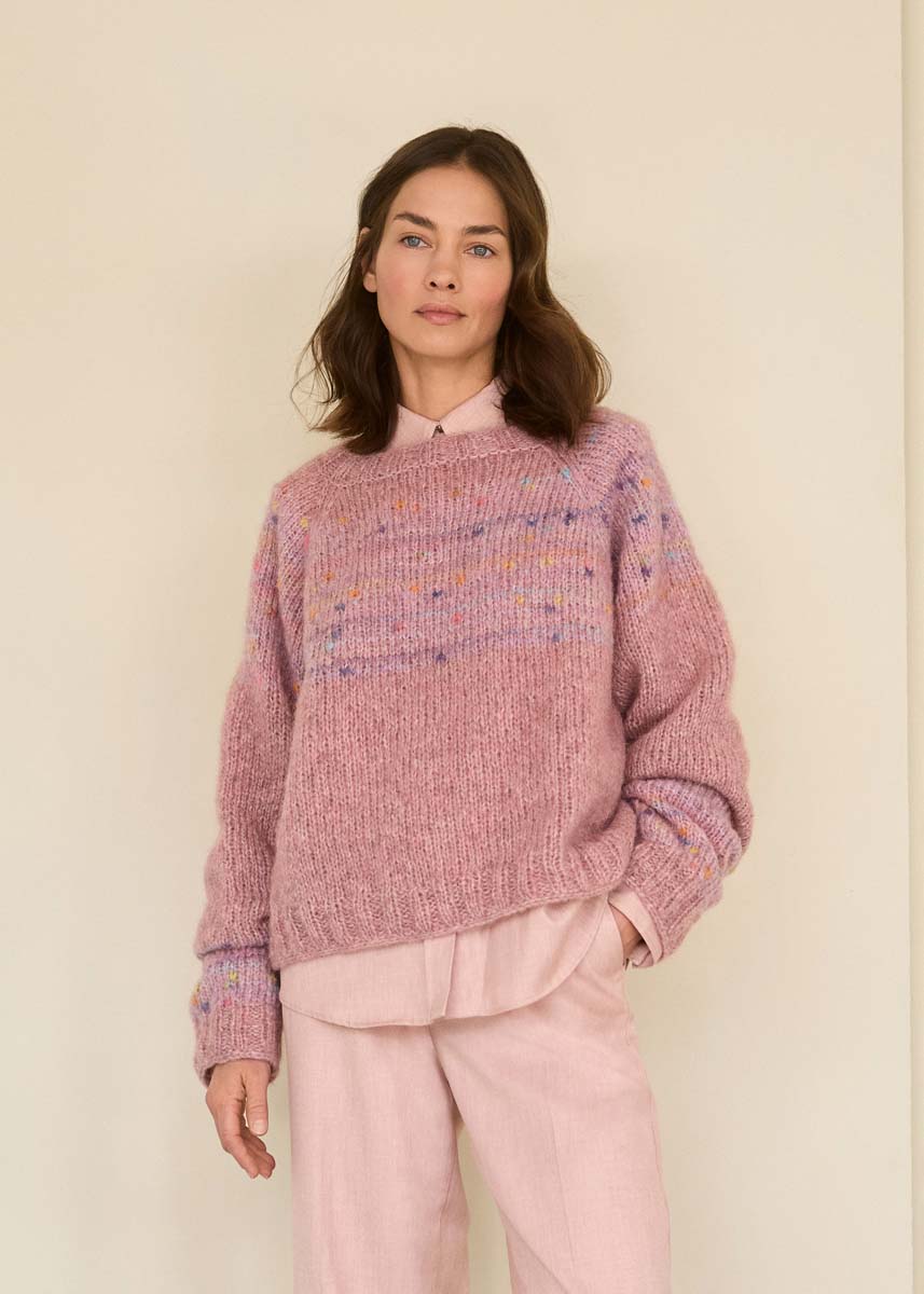 Lana Grossa «Alpaca Air II» (50 % Alpaca. (baby), 27 % polyamid, 14 % bomull, 9 % ren ny ull (merino), LL = ca. 140 m/50 g): 250 (250 - 300 - 300) g gammelrosa (frg 29), Lana Grossa «Cassata» (54 % ren ny ull (merino extrafine), 30 % polyamid, 16 % bomull, LL = ca. 175 m/50 g): 50 (100 - 100 - 100) g dus lilla/rosa/gul/lilla (frg 3) Pinner: Kort og lang rundpinne nr. 4,5 og 5,5, strømpepinner nr. 4,5